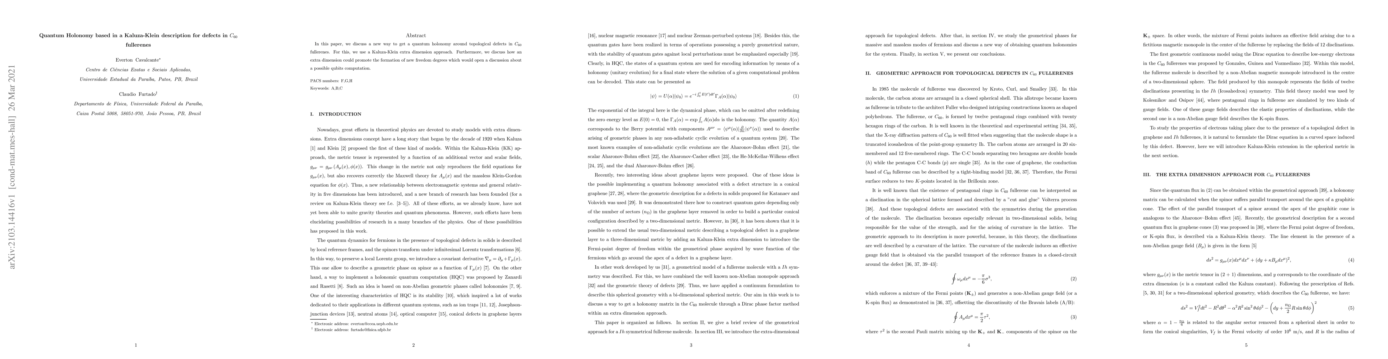 In this paper, we discuss a new way to get a quantum holonomy around topological defects in $C_{60}$ fullerenes. For this, we use a Kaluza-Klein extra dimension approach. Furthermore, we discuss how an extra dimension could promote the formation of new freedom degrees which would open a discussion about a possible qubits computation.