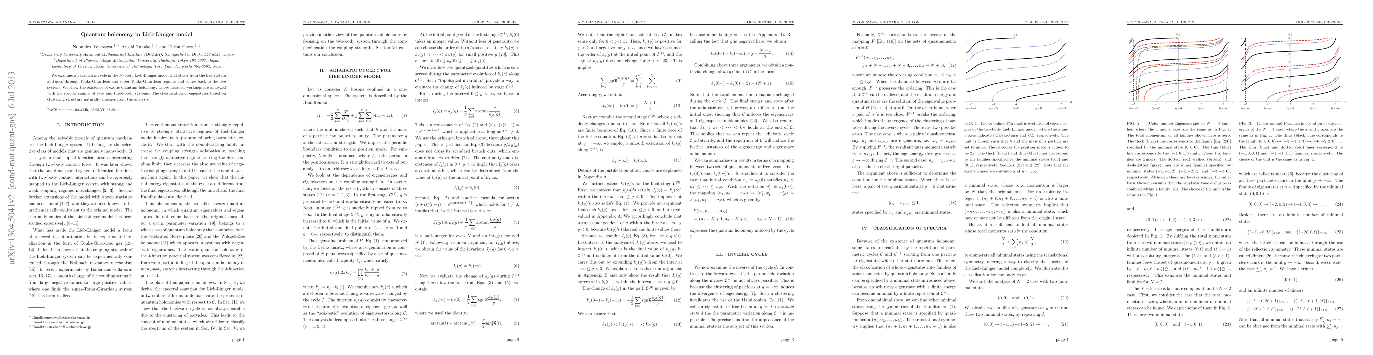 The paper presents a detailed analysis of quantum holonomy in the Lieb-Liniger model, classifying eigenstates based on clustering properties and demonstrating a mapping between quasimomenta of free bosons.