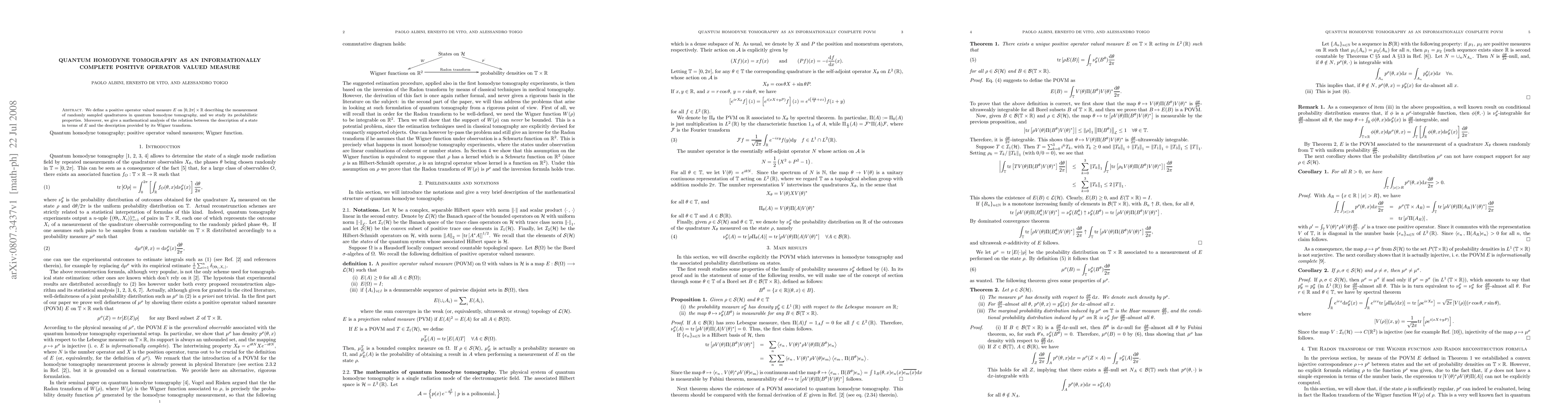 This paper defines a positive operator valued measure $E$ for quantum homodyne tomography and analyzes its probabilistic properties. It also explores the relationship between the state description using $E$ and its Wigner transform representation.