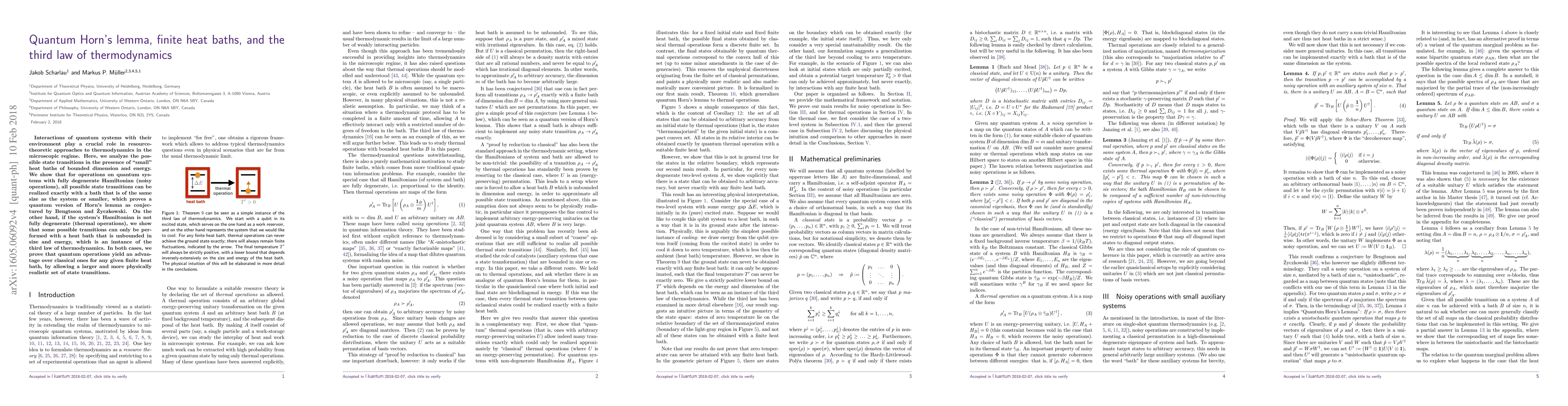 This paper demonstrates that quantum systems can achieve state transitions with smaller heat baths compared to classical systems, proving a quantum version of Horn's lemma for degenerate Hamiltonians. It also shows that non-degenerate Hamiltonians require larger heat baths, aligning with the third law of thermodynamics.