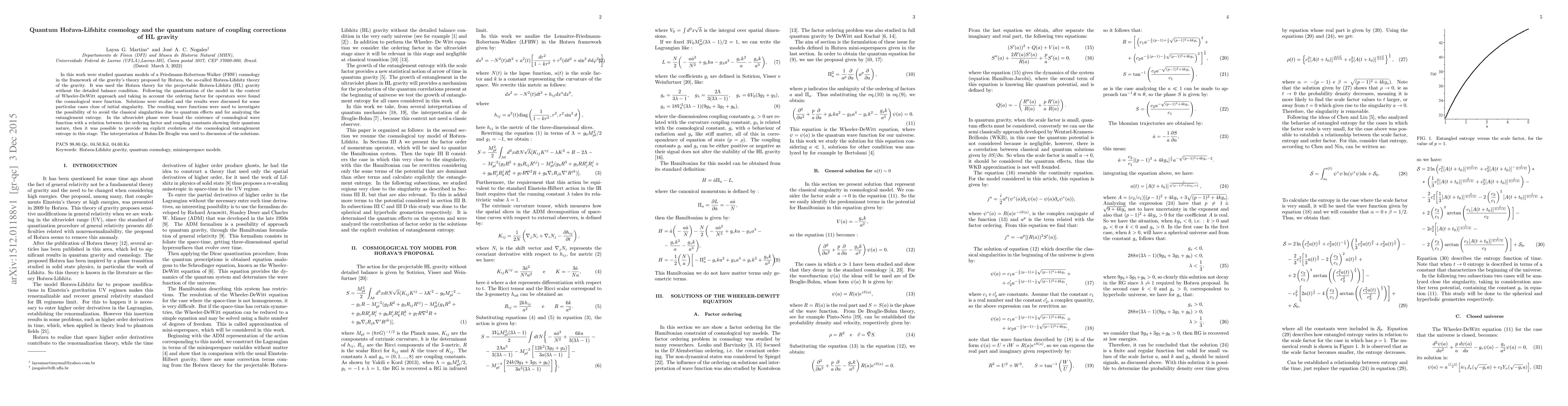 This paper explores quantum models of a Friedmann-Robertson-Walker cosmology within the Hořava-Lifshitz gravity framework, focusing on the quantum nature of coupling corrections. It quantizes the model using Wheeler-DeWitt approach and analyzes the cosmological wave function to discuss potential singularity avoidance and entanglement entropy.