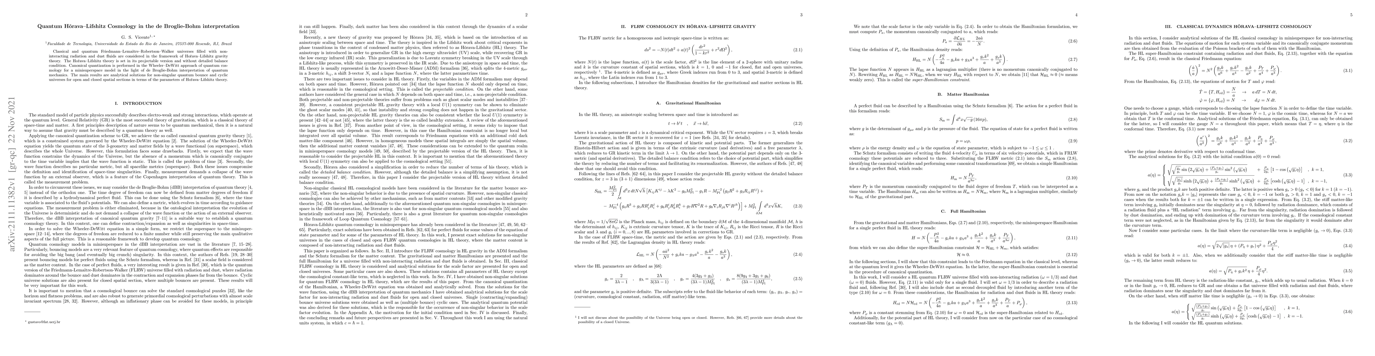 Classical and quantum Friedmann-Lema\^itre-Robertson-Walker universes filled with non-interacting radiation and dust fluids are considered in the framework of Ho\v{r}ava-Lifshitz gravity theory. The Ho\v{r}ava-Lifshitz theory is set in its projectable version and without detailed balance condition. Canonical quantization is performed in the Wheeler-DeWitt approach of quantum cosmology for a minisuperspace model in the light of de Broglie-Bohm interpretation of quantum mechanics. The main results are analytical solutions for non-singular quantum bounce and cyclic universes for open and closed spatial sections in terms of the parameters of Ho\v{r}ava-Lifshitz theory.