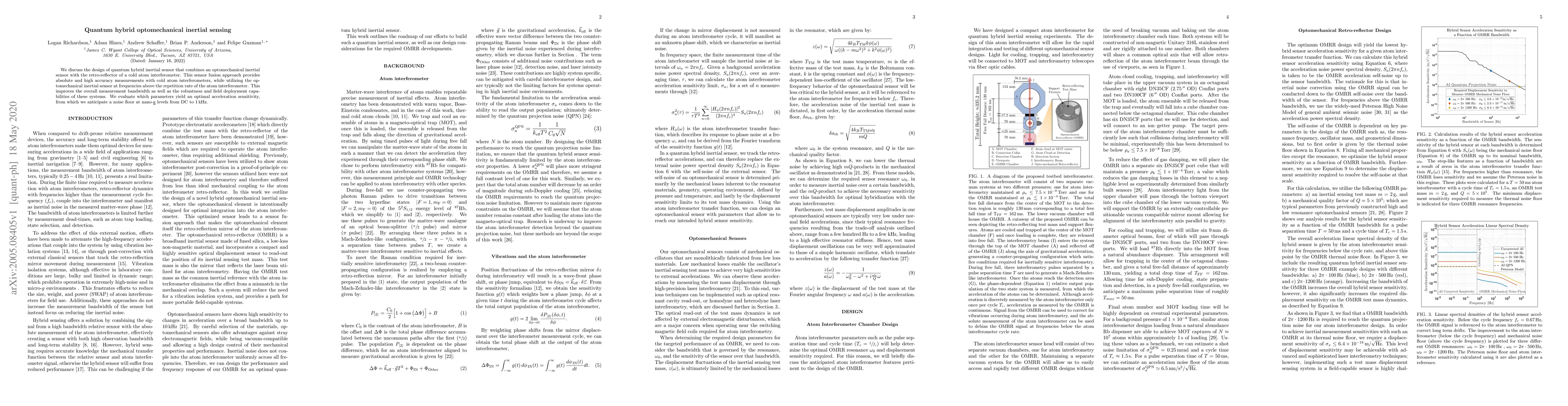 This paper proposes a quantum hybrid inertial sensor combining an optomechanical sensor with a cold atom interferometer to achieve high-accuracy, absolute measurements, enhancing measurement bandwidth and robustness. The study evaluates parameters for optimal acceleration sensitivity, aiming for a noise floor at nano-g levels from DC to 1 kHz.