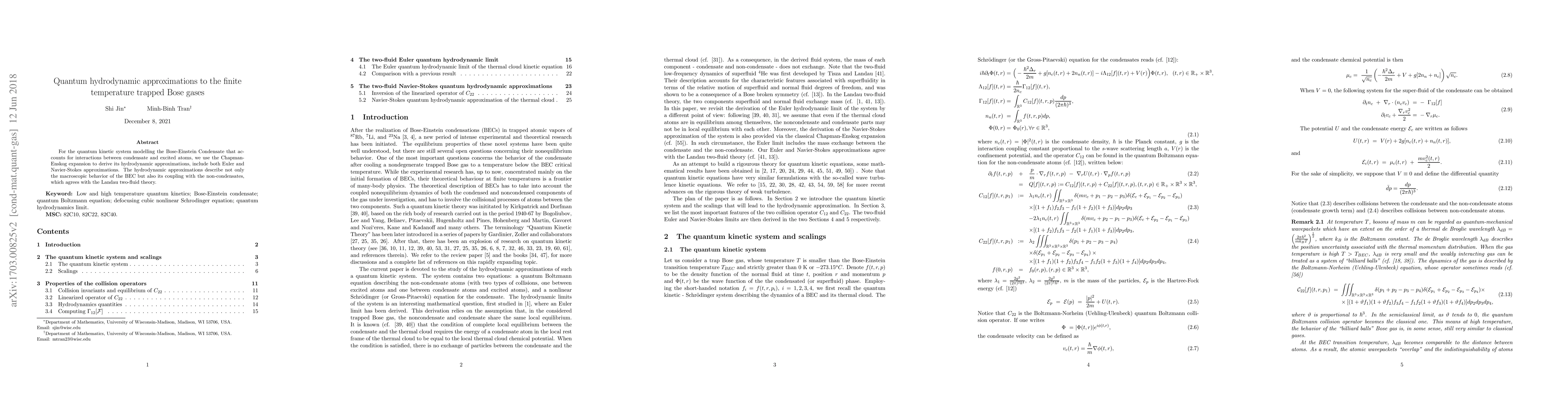 For the quantum kinetic system modelling the Bose-Einstein Condensate that accounts for interactions between condensate and excited atoms, we use the Chapman-Enskog expansion to derive its hydrodynamic approximations, include both Euler and Navier-Stokes approximations. The hydrodynamic approximations describe not only the macroscopic behavior of the BEC but also its coupling with the non-condensates, which agrees with Landau's two fluid theory.
