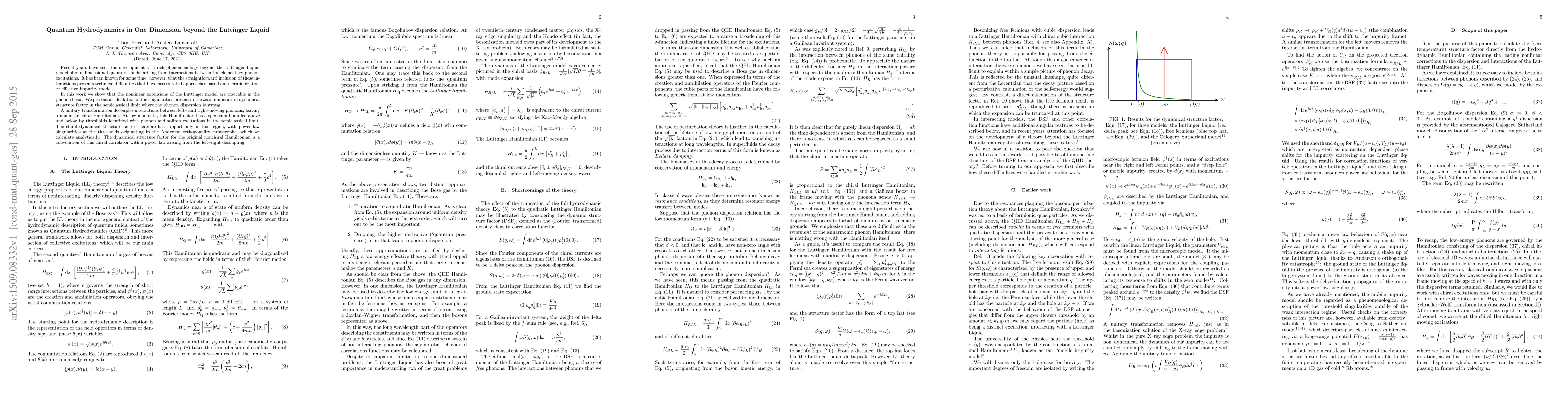 This paper explores the nonlinear extensions of the Luttinger model for one-dimensional quantum fluids beyond the Luttinger Liquid framework, demonstrating their tractability in the phonon basis. It reveals a decoupling of left- and right-moving phonons via a unitary transformation, resulting in a chiral Hamiltonian with power law singularities at phonon and soliton thresholds, calculated analytically.