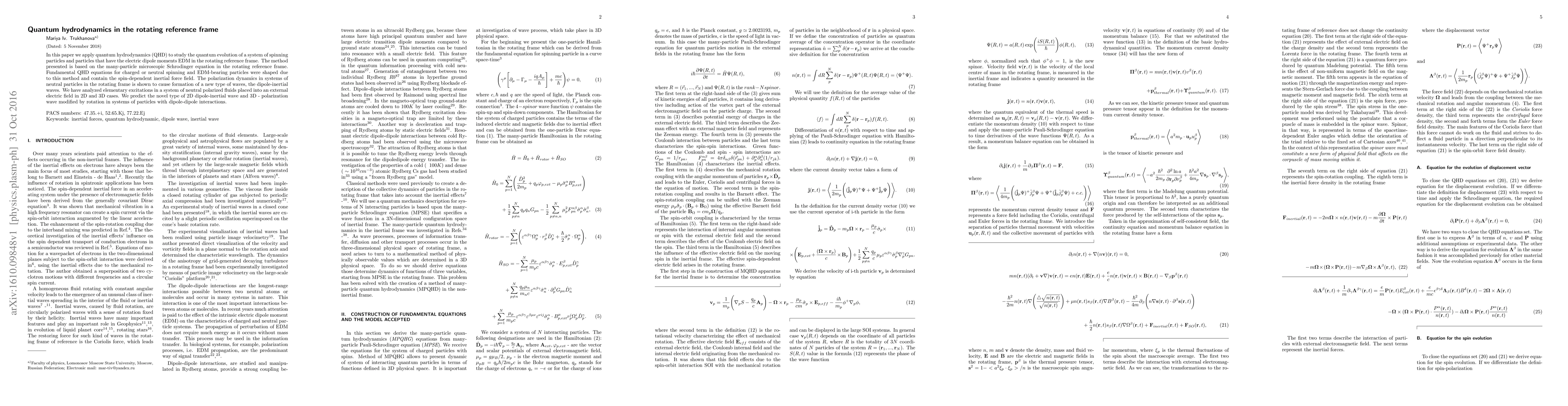 In this paper we apply quantum hydrodynamics (QHD) to study the quantum evolution of a system of spinning particles and particles that have the electric dipole moments EDM in the rotating reference frame. The method presented is based on the many-particle microscopic Schrodinger equation in the rotating reference frame. Fundamental QHD equations for charged or neutral spinning and EDM-bearing particles were shaped due to this method and contain the spin-dependent inertial force field. The polarization dynamics in systems of neutral particles in the rotating frame is shown to cause formation of a new type of waves, the dipole-inertial waves. We have analyzed elementary excitations in a system of neutral polarized fluids placed into an external electric field in 2D and 3D cases. We predict the novel type of 2D dipole-inertial wave and 3D - polarization wave modified by rotation in systems of particles with dipole-dipole interactions.