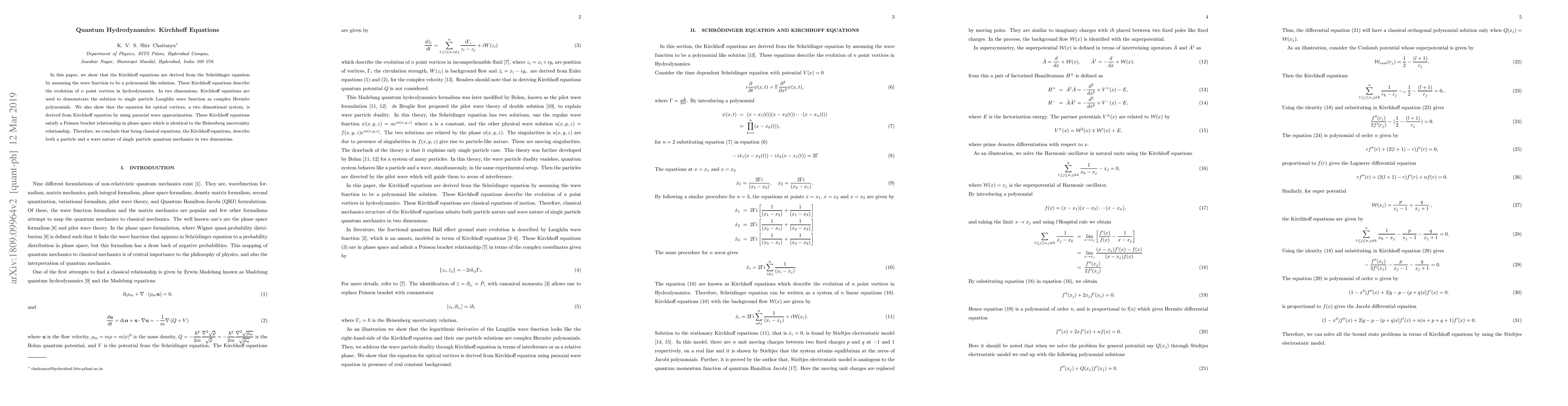 In this paper, we show that the Kirchhoff equations are derived from the Schr\"odinger equation by assuming the wave function to be a polynomial like solution. These Kirchhoff equations describe the evolution of $n$ point vortices in hydrodynamics. In two dimensions, Kirchhoff equations are used to demonstrate the solution to single particle Laughlin wave function as complex Hermite polynomials. We also show that the equation for optical vortices, a two dimentional system, is derived from Kirchhoff equation by using paraxial wave approximation. These Kirchhoff equations satisfy a Poisson bracket relationship in phase space which is identical to the Heisenberg uncertainty relationship. Therefore, we conclude that being classical equations, the Kirchhoff equations, describe both a particle and a wave nature of single particle quantum mechanics in two dimensions.