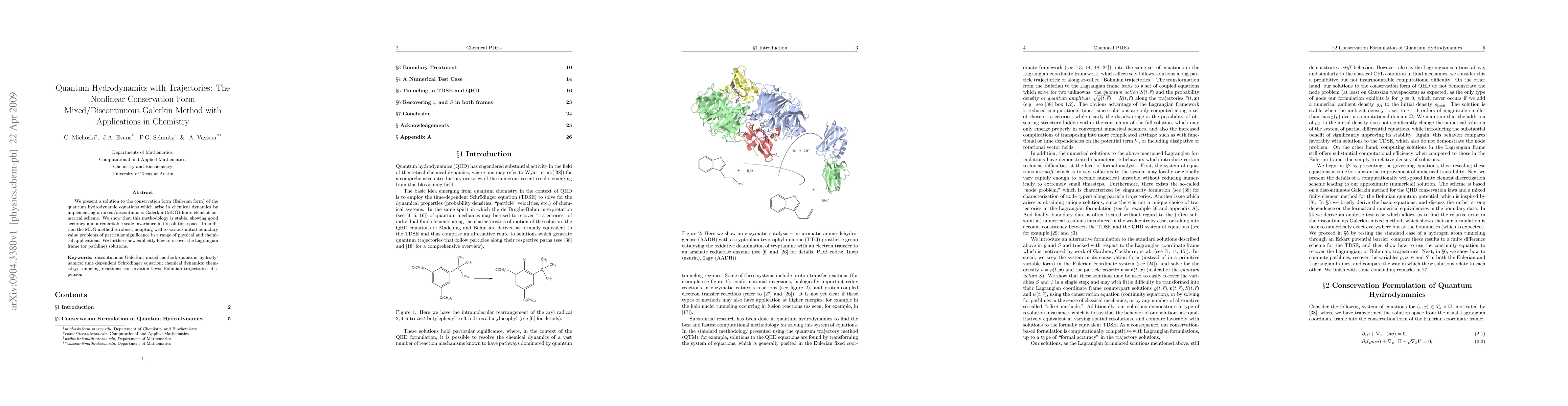 We present a solution to the conservation form (Eulerian form) of the quantum hydrodynamic equations which arise in chemical dynamics by implementing a mixed/discontinuous Galerkin (MDG) finite element numerical scheme. We show that this methodology is stable, showing good accuracy and a remarkable scale invariance in its solution space. In addition the MDG method is robust, adapting well to various initial-boundary value problems of particular significance in a range of physical and chemical applications. We further show explicitly how to recover the Lagrangian frame (or pathline) solutions.