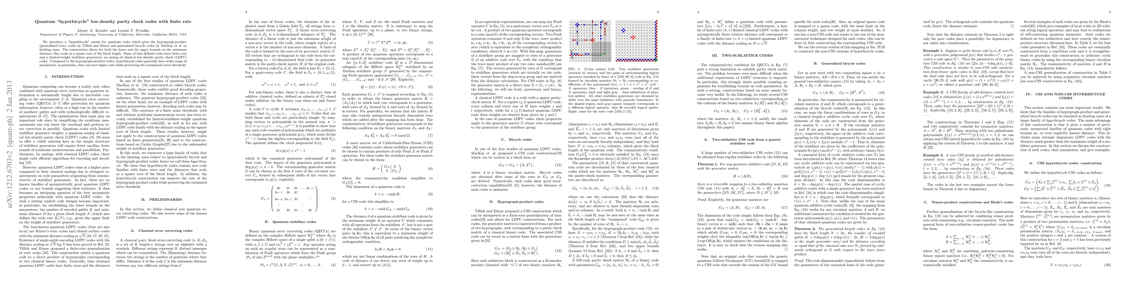 This paper proposes a "hyperbicycle" ansatz for quantum low-density parity check codes, which generalizes existing quantum codes and allows for a wider range of parameters, potentially higher rates, and maintains the error threshold. These codes exhibit a scaling of minimum distance proportional to the square root of the block length.