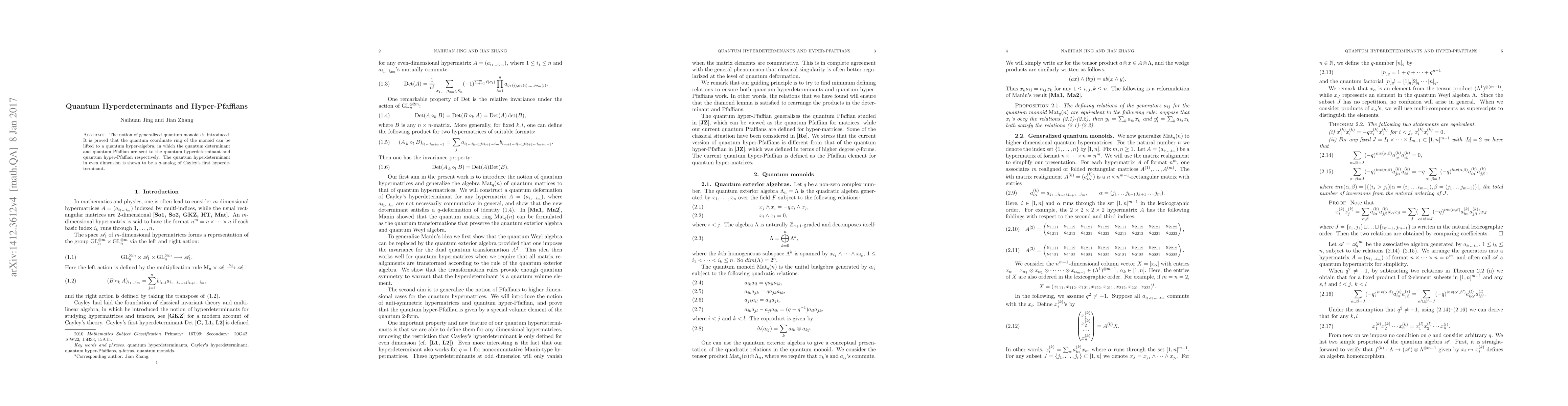 The notion of generalized quantum monoids is introduced. It is proved that the quantum coordinate ring of the monoid can be lifted to a quantum hyper-algebra, in which the quantum determinant and quantum Pfaffian are sent to the quantum hyperdeterminant and quantum hyper-Pfaffian respectively. The quantum hyperdeterminant in even dimension is shown to be a $q$-analog of Cayley's first hyperdeterminant.