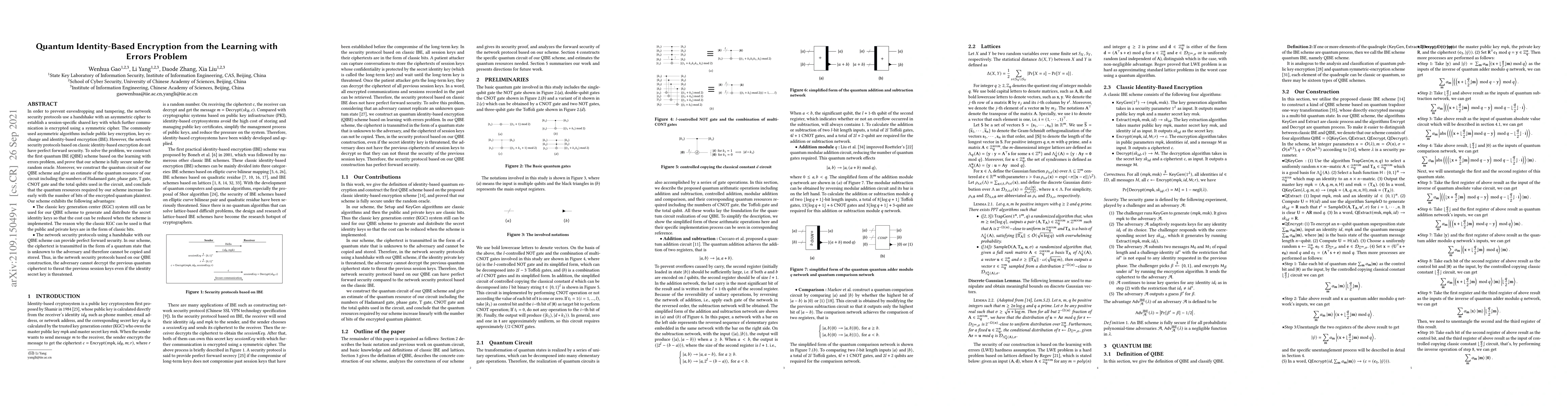 This paper proposes the first quantum identity-based encryption (QIBE) scheme based on the learning with errors problem, ensuring perfect forward security. The scheme utilizes a quantum circuit with resource requirements that scale linearly with the encrypted quantum plaintext size.