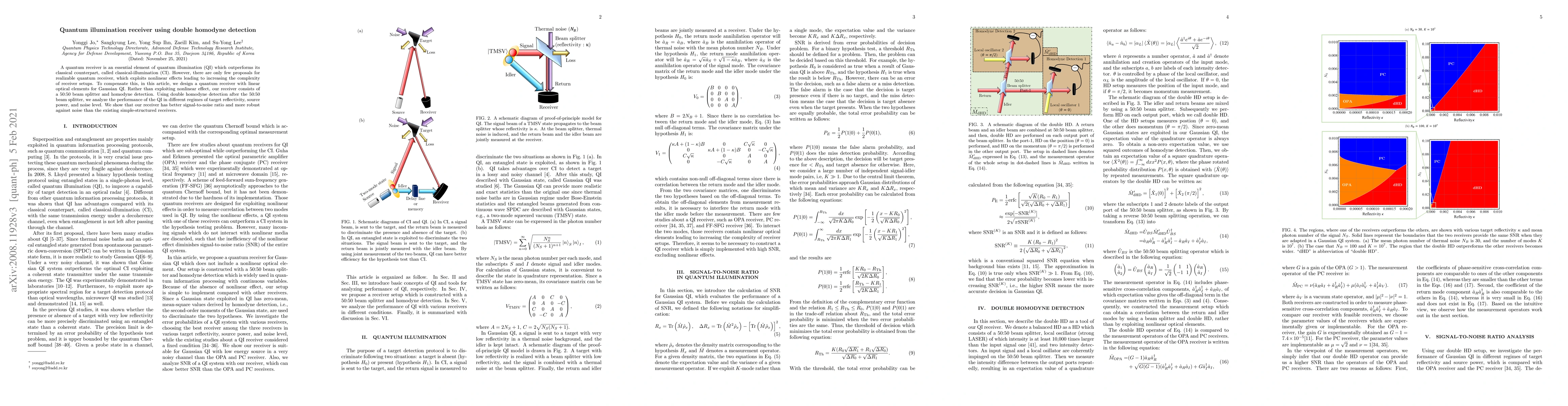 This paper proposes a quantum receiver for quantum illumination using linear optical elements, specifically a 50:50 beam splitter and double homodyne detection. It demonstrates superior signal-to-noise ratio and noise robustness compared to existing simple-structured receivers.