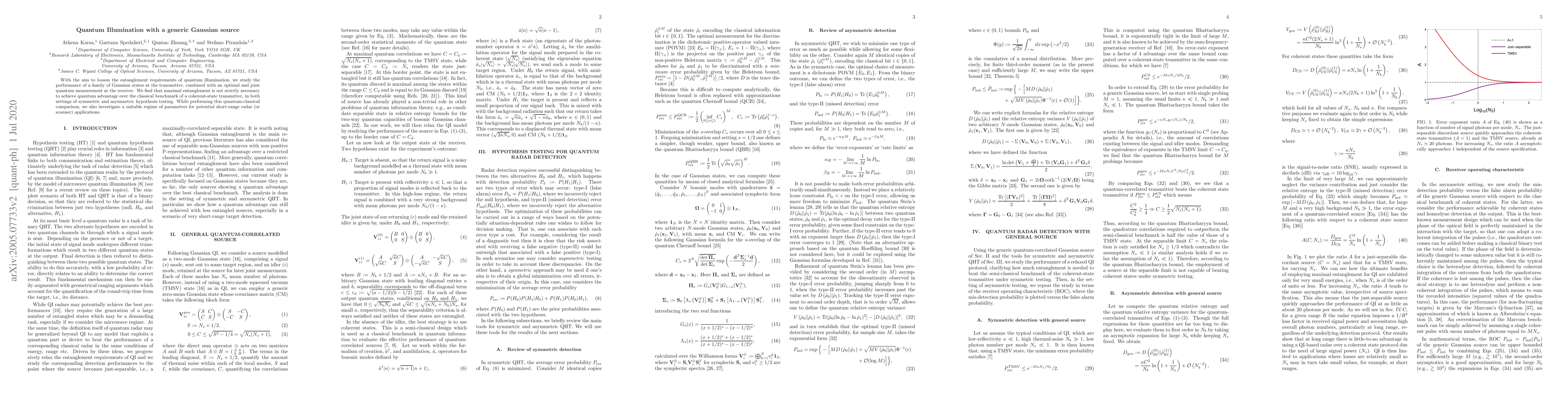 This paper explores the performance of Gaussian states in quantum illumination, demonstrating that maximal entanglement is not essential for achieving quantum advantage over classical methods in both symmetric and asymmetric hypothesis testing scenarios. The study also identifies parameter regimes suitable for short-range radar applications.