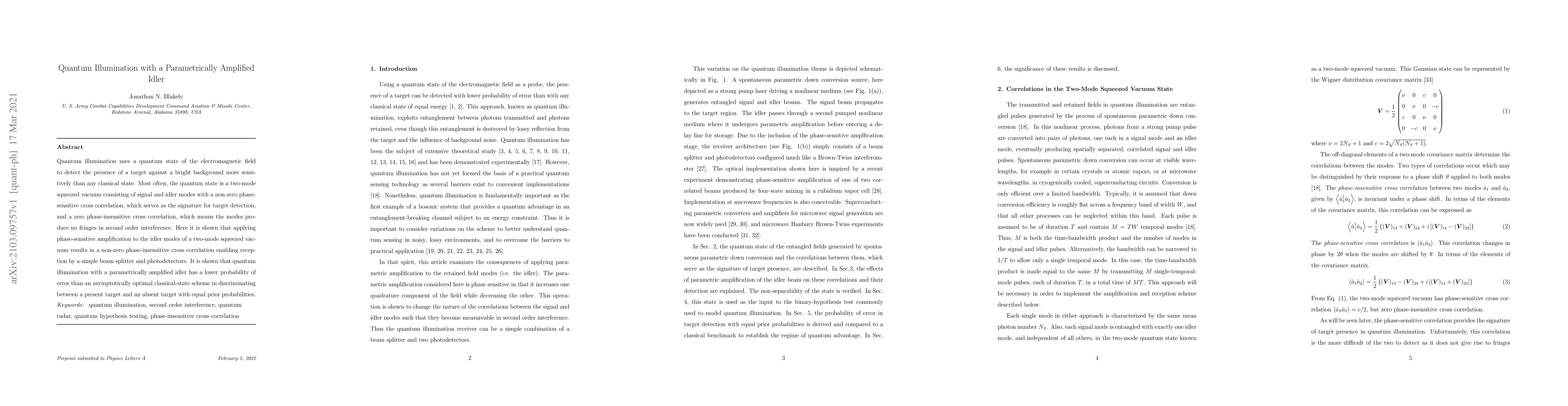 This paper explores quantum illumination using a parametrically amplified idler mode of a two-mode squeezed vacuum, demonstrating improved detection sensitivity over classical methods. The amplified idler mode allows for simpler detection via a beam splitter and photodetectors, showing a lower error probability in target discrimination compared to optimal classical schemes.
