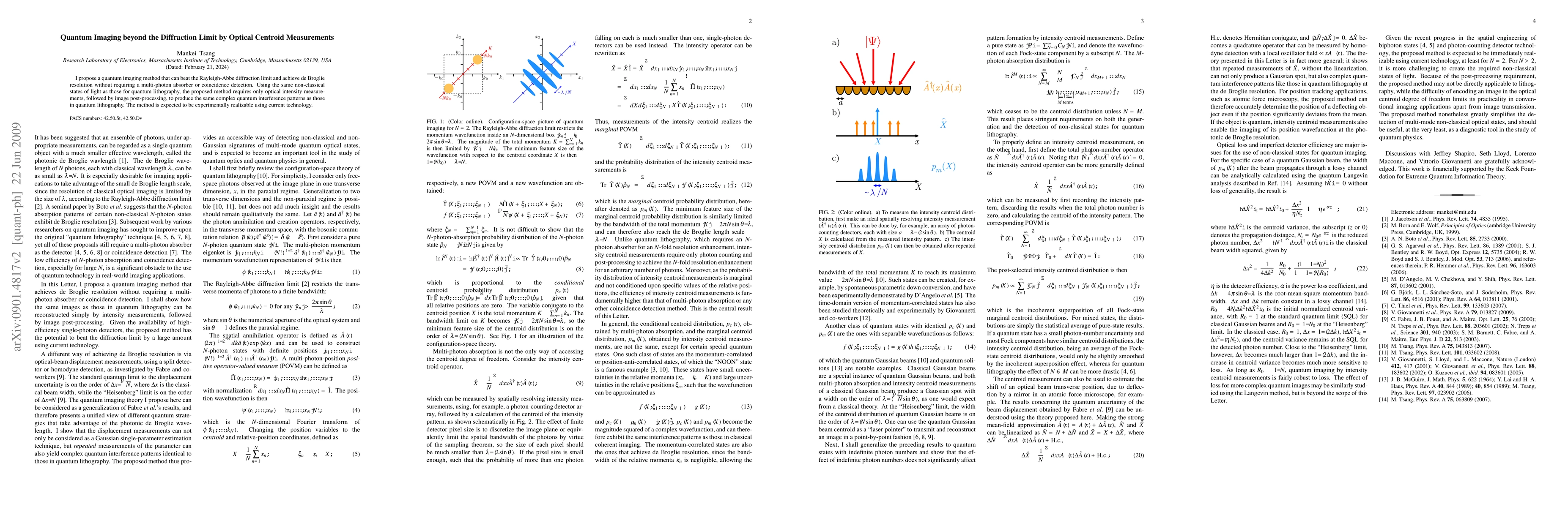 This paper proposes a quantum imaging technique that surpasses the diffraction limit using optical centroid measurements, achieving de Broglie resolution without a multiphoton detector. It leverages non-classical light states and only requires intensity measurements and post-processing, making it feasible with current technology.