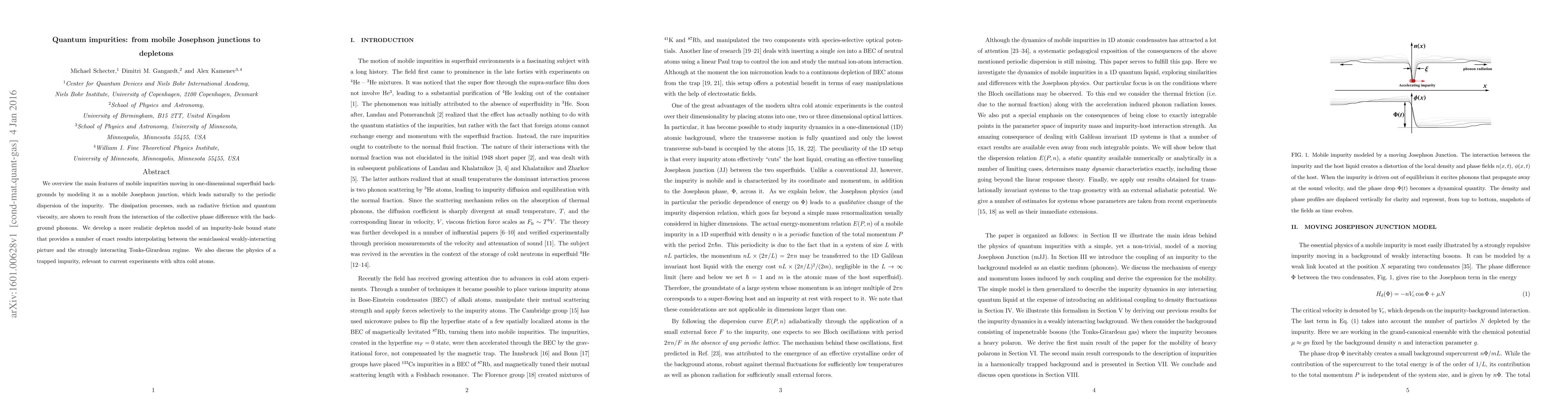 We overview the main features of mobile impurities moving in one-dimensional superfluid backgrounds by modeling it as a mobile Josephson junction, which leads naturally to the periodic dispersion of the impurity. The dissipation processes, such as radiative friction and quantum viscosity, are shown to result from the interaction of the collective phase difference with the background phonons. We develop a more realistic depleton model of an impurity-hole bound state that provides a number of exact results interpolating between the semiclassical weakly-interacting picture and the strongly interacting Tonks-Girardeau regime. We also discuss the physics of a trapped impurity, relevant to current experiments with ultra cold atoms.