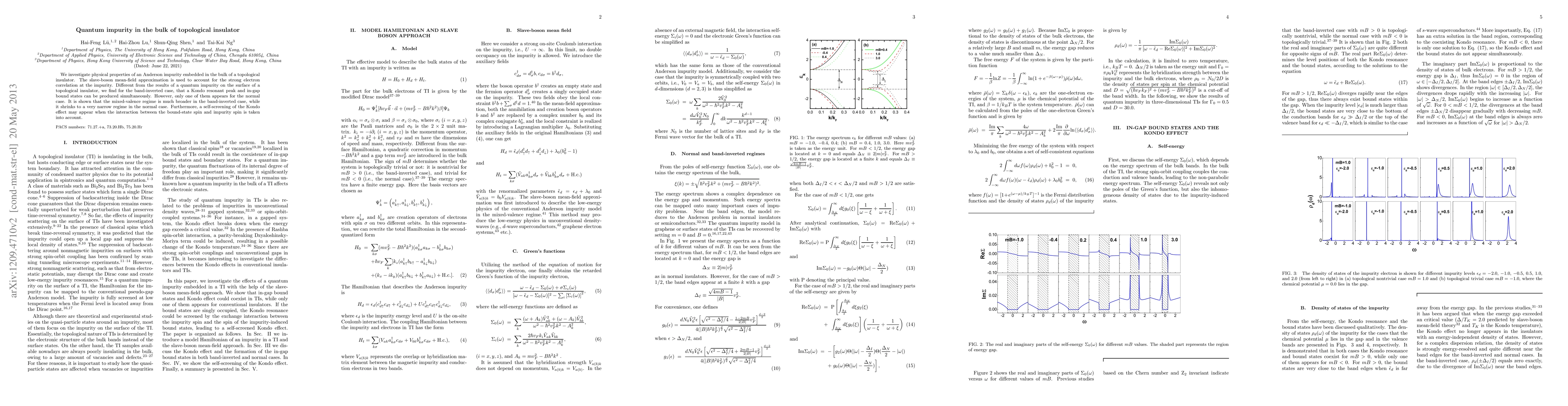 We investigate physical properties of an Anderson impurity embedded in the bulk of a topological insulator. The slave-boson mean-field approximation is used to account for the strong electron correlation at the impurity. Different from the results of a quantum impurity on the surface of a topological insulator, we find for the band-inverted case, a Kondo resonant peak and in-gap bound states can be produced simultaneously. However, only one type of them appears for the normal case. It is shown that the mixed-valence regime is much broader in the band-inverted case, while it shrinks to a very narrow regime in the normal case. Furthermore, a self-screening of the Kondo effect may appear when the interaction between the bound-state spin and impurity spin is taken into account.