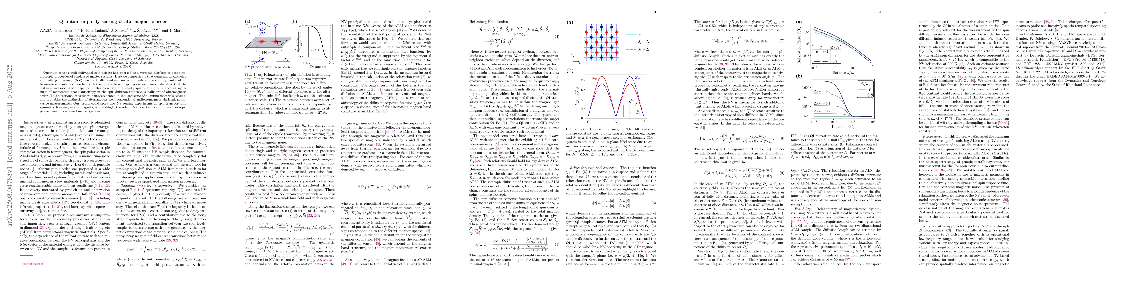 The paper presents a detailed theoretical framework for quantum impurity sensing of altermagnetic spin diffusion, including the magneto-static Green's function, geometric factor of the relaxation rate, and the magnon diffusion tensor.