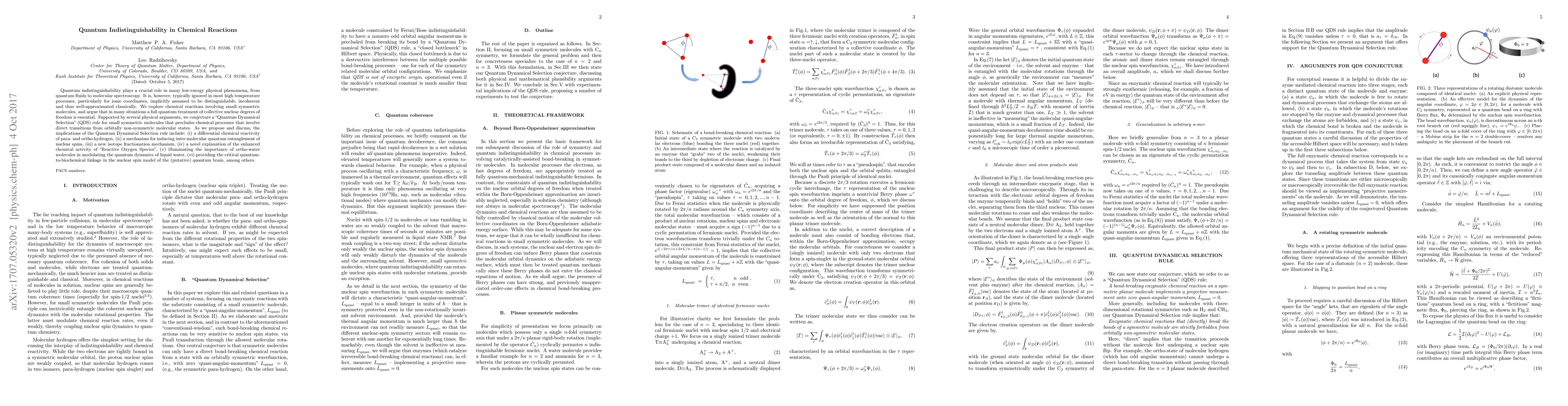 This paper argues that quantum indistinguishability must be considered in chemical reactions involving small symmetric molecules, proposing a "Quantum Dynamical Selection" (QDS) rule that restricts direct transitions from orbitally non-symmetric states, with implications ranging from differential reactivity of hydrogen isotopes to the quantum dynamics of liquid water and the nuclear spin model of the brain.