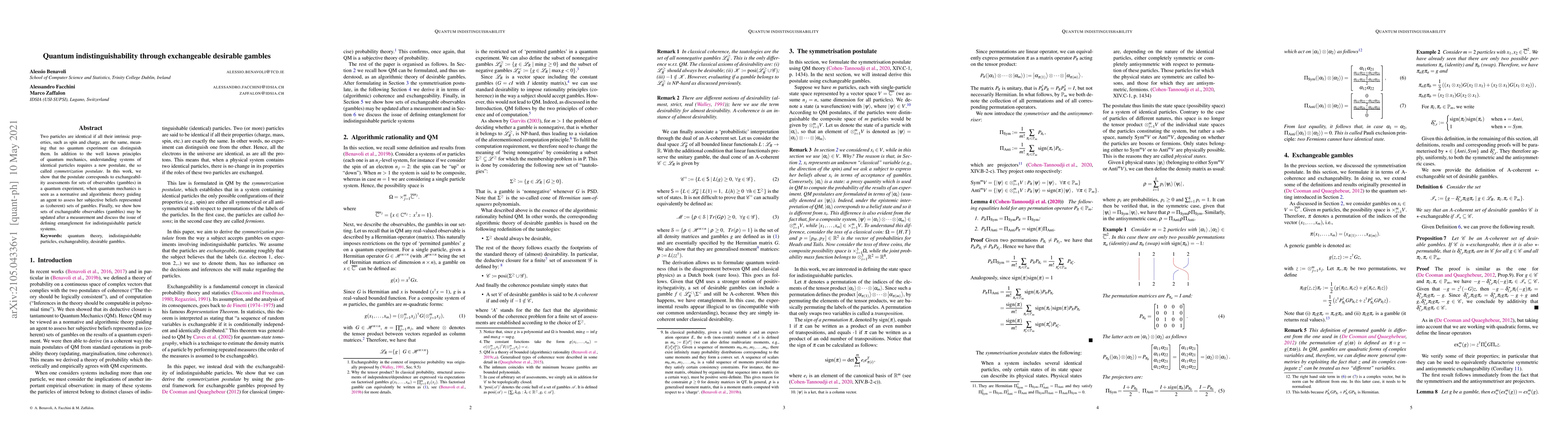 Researchers show that quantum indistinguishability in particles can be understood through exchangeable desirable gambles, a new postulate for identical particle systems. This work provides a novel framework for updating sets of observables after measurement and redefines entanglement for indistinguishable particles.