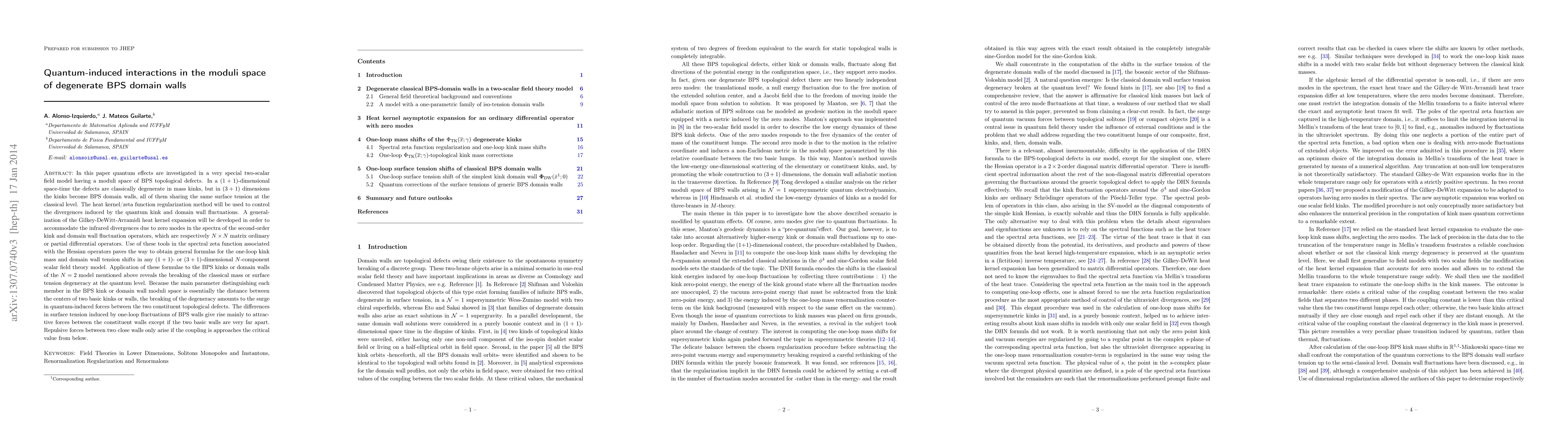 In this paper quantum effects are investigated in a very special two-scalar field model having a moduli space of BPS topological defects. In a $(1+1)$-dimensional space-time the defects are classically degenerate in mass kinks, but in $(3+1)$ dimensions the kinks become BPS domain walls, all of them sharing the same surface tension at the classical level. The heat kernel/zeta function regularization method will be used to control the divergences induced by the quantum kink and domain wall fluctuations. A generalization of the Gilkey-DeWitt-Avramidi heat kernel expansion will be developed in order to accommodate the infrared divergences due to zero modes in the spectra of the second-order kink and domain wall fluctuation operators, which are respectively $N\times N$ matrix ordinary or partial differential operators. Use of these tools in the spectral zeta function associated with the Hessian operators paves the way to obtain general formulas for the one-loop kink mass and domain wall tension shifts in any $(1+1)$- or $(3+1)$-dimensional $N$-component scalar field theory model. Application of these formulae to the BPS kinks or domain walls of the $N=2$ model mentioned above reveals the breaking of the classical mass or surface tension degeneracy at the quantum level. Because the main parameter distinguishing each member in the BPS kink or domain wall moduli space is essentially the distance between the centers of two basic kinks or walls, the breaking of the degeneracy amounts to the surge in quantum-induced forces between the two constituent topological defects. The differences in surface tension induced by one-loop fluctuations of BPS walls give rise mainly to attractive forces between the constituent walls except if the two basic walls are very far apart. Repulsive forces between two close walls only arise if the coupling is approaches the critical value from below.