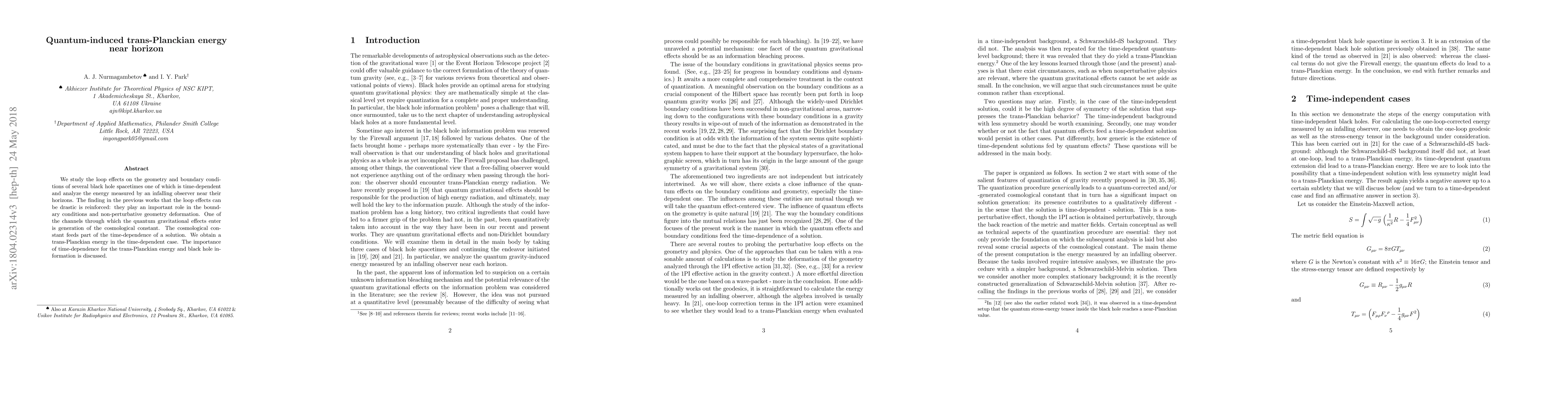 We study the loop effects on the geometry and boundary conditions of several black hole spacetimes one of which is time-dependent and analyze the energy measured by an infalling observer near their horizons. The finding in the previous works that the loop effects can be drastic is reinforced: they play an important role in the boundary conditions and non-perturbative geometry deformation. One of the channels through which the quantum gravitational effects enter is generation of the cosmological constant. The cosmological constant feeds the time-dependence of a solution. We obtain a trans-Planckian energy in the time-dependent case. The importance of time-dependence for the trans-Planckian energy and black hole information is discussed.