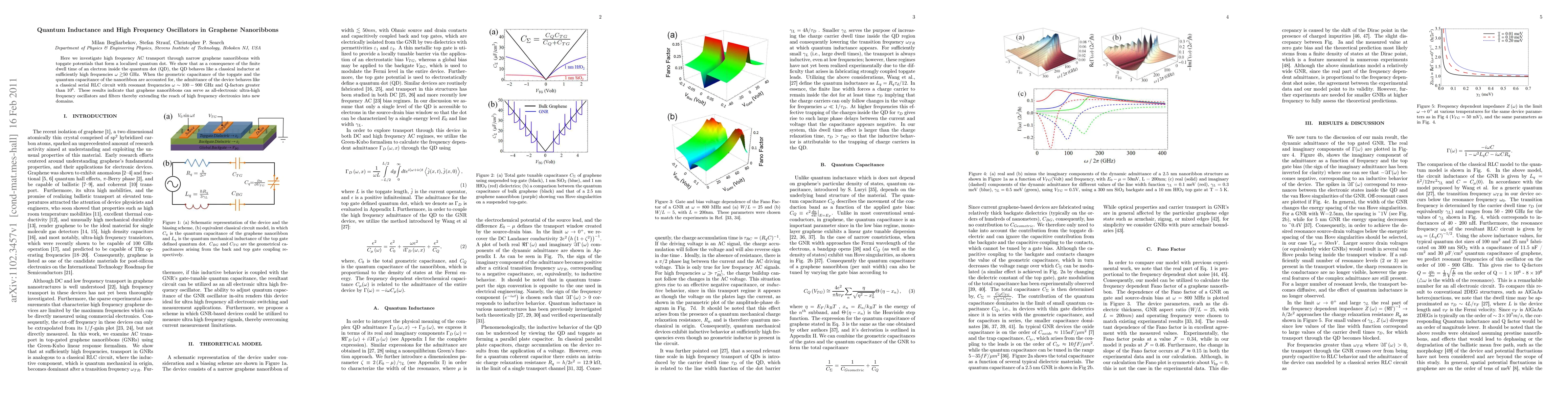 Here we investigate high frequency AC transport through narrow graphene nanoribbons with topgate potentials that form a localized quantum dot. We show that as a consequence of the finite dwell time of an electron inside the quantum dot (QD), the QD behaves like a classical inductor at sufficiently high frequencies \omega\gtrsim50 GHz. When the geometric capacitance of the topgate and the quantum capacitance of the nanoribbon are accounted for, the admittance of the device behaves like a classical serial RLC circuit with resonant frequencies \omega\sim100-900 GHz and Q-factors greater than 10^{6}. These results indicate that graphene nanoribbons can serve as all-electronic ultra-high frequency oscillators and filters thereby extending the reach of high frequency electronics into new domains.