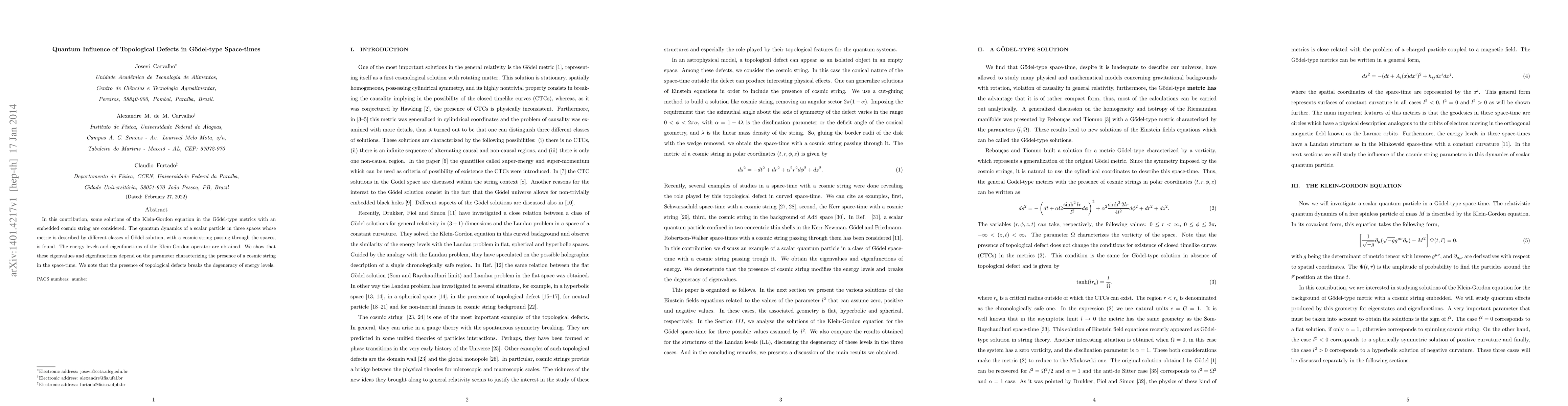 This paper investigates the quantum dynamics of a scalar particle in Gödel-type space-times with a cosmic string, revealing that the presence of topological defects alters energy levels and eigenfunctions, breaking the degeneracy typically found in such metrics.