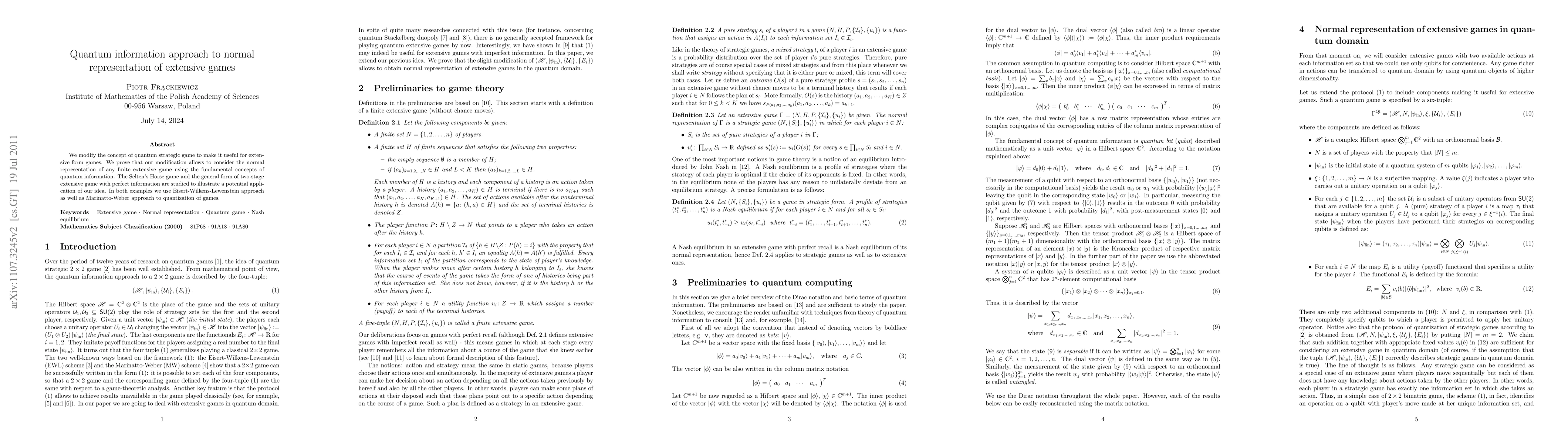 This paper proposes a quantum information approach to represent the normal form of extensive games, adapting quantum strategic game concepts. It demonstrates the application of this method to Selten's Horse game and two-stage extensive games, utilizing the Eisert-Wilkens-Lewenstein and Marinatto-Weber quantization techniques.