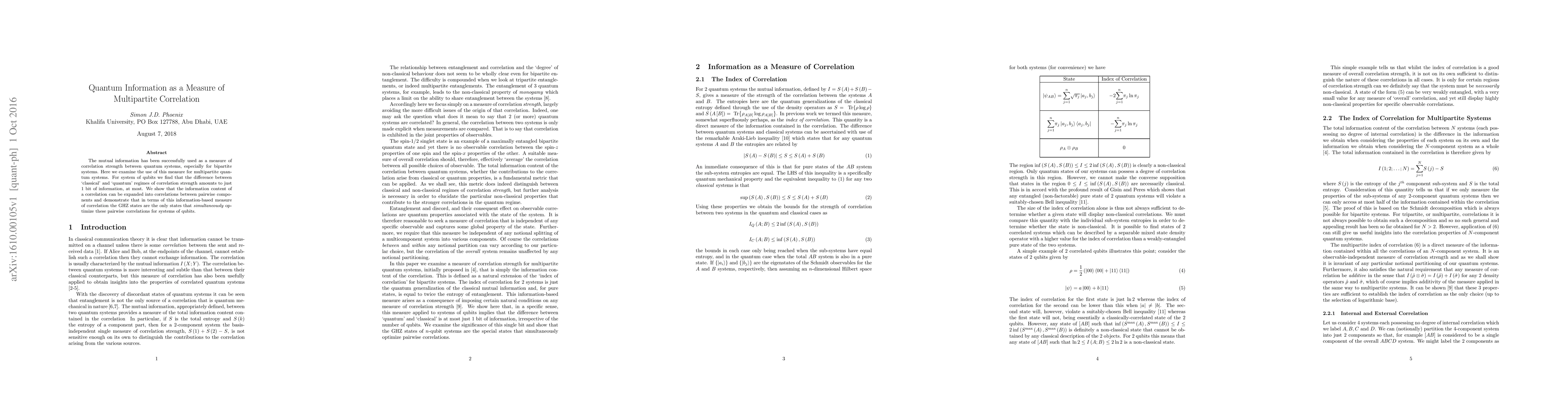 This paper explores the application of mutual information to quantify correlations in multipartite quantum systems, revealing that the difference between classical and quantum correlation strengths is limited to 1 bit. It demonstrates that GHZ states uniquely maximize pairwise correlations in qubit systems.