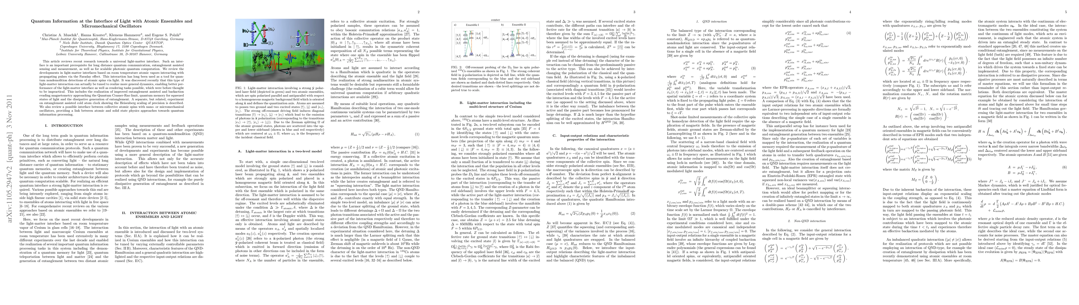 This paper reviews advancements in light-matter interfaces using atomic ensembles and micromechanical oscillators for quantum communication and computation, highlighting improved entanglement-assisted sensing and quantum memory. It also explores the potential interface between atomic spins and nano- or micromechanical oscillators.