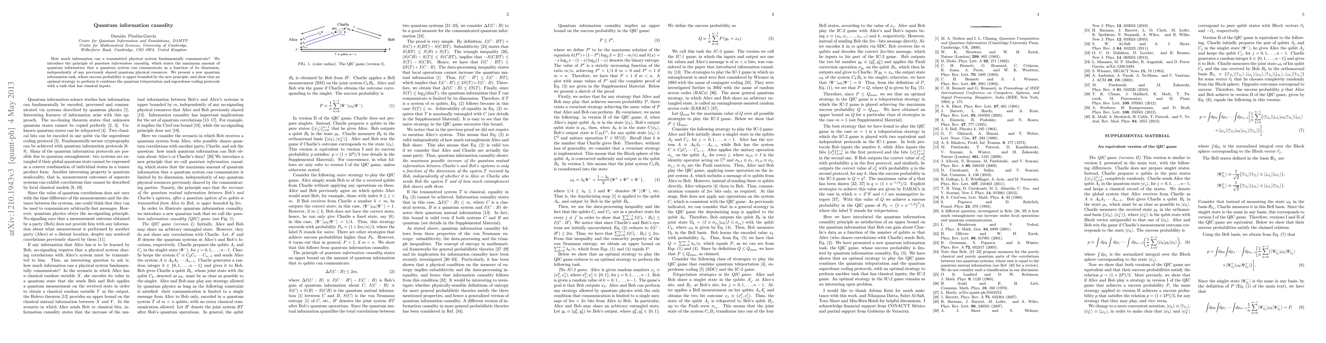 Summary: The paper introduces the principle of quantum information causality, defining the maximum quantum information a system can communicate based on its dimension, and proposes a new quantum information task whose success is bounded by this principle. The optimal strategy for this task combines quantum teleportation and superdense coding with classical inputs.
