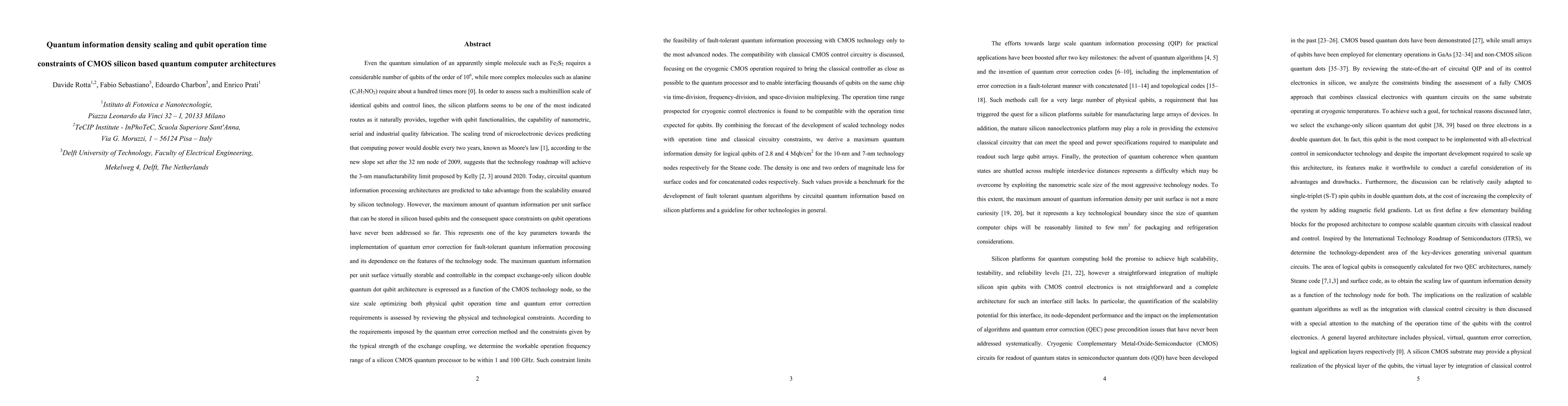Even the quantum simulation of simple molecules such as Fe$_2$S$_2$ requires more than 10$^6$ qubits. In order to assess such a multimillion scale of identical qubits and control lines, the silicon platform seems to be one of the most indicated routes as it provides the capability of nanometric, serial and industrial quality fabrication. The maximum amount of quantum information per unit surface and the consequent space constraints on qubit operations are key parameters towards fault-tolerant quantum information processing (QIP) with Si qubits. Such maximum density of quantum information is expressed for the compact exchange-only Si double quantum dot qubit architecture as a function of the CMOS technology node. The size scale optimizing both physical qubit operation time and quantum error correction (QEC) requirements is assessed by reviewing the physical and technological constraints. We determine the workable operation frequency range of a Si-CMOS quantum processor to be within 1 and 100 GHz, which limits its feasibility only to the most advanced nodes. The compatibility with classical control circuitry is discussed, focusing on the cryogenic CMOS operation required to bring the classical controller as close as possible to the quantum processor and to enable interfacing thousands of qubits on the same chip. The operation time range prospected for cryogenic control electronics is found to be compatible with the qubit operation time. By combining the forecast of technology development with operation time and classical circuitry constraints, we derive a maximum quantum information density for logical qubits of 2.8 and 4 Mqb/cm$^2$ for the 10-nm and 7-nm technology nodes respectively for the Steane code. The density is one and two orders of magnitude less for surface and concatenated codes respectively. Such values provide a benchmark for the development of Si-based fault tolerant QIP.