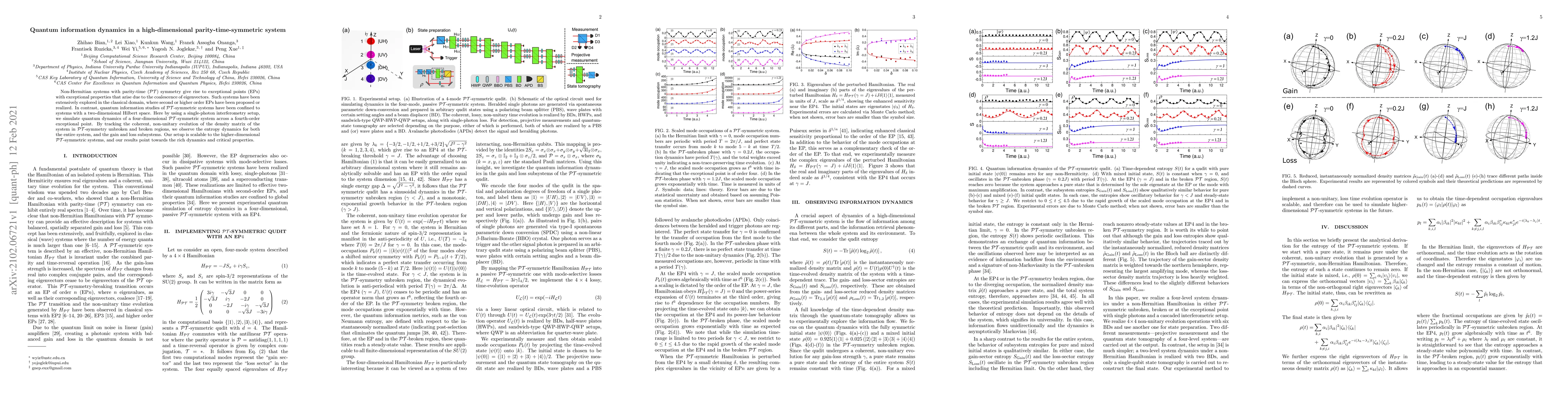 This paper investigates quantum dynamics in a four-dimensional parity-time-symmetric system using single-photon interferometry, simulating evolution across a fourth-order exceptional point and observing entropy dynamics in both unbroken and broken $\mathcal{PT}$-symmetry regions. The scalable setup highlights the rich dynamics and critical properties of higher-dimensional $\mathcal{PT}$-symmetric systems.