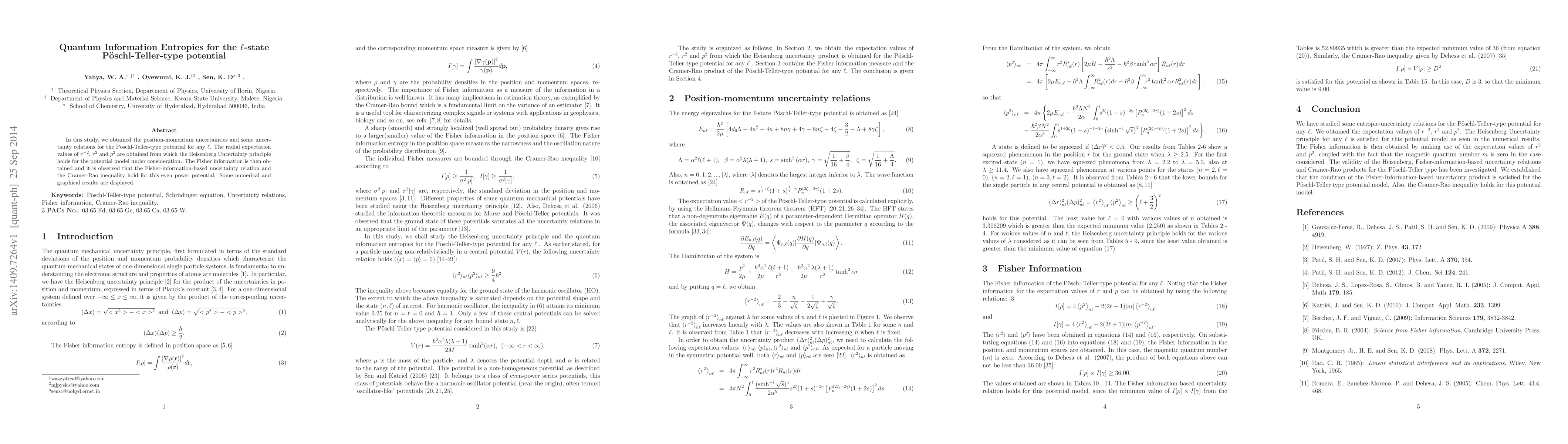 In this study, we obtained the position-momentum uncertainties and some uncertainty relations for the P\"oschl-Teller-type potential for any $\ell$. The radial expectation values of $r^{-2}$, $r^{2}$ and $p^{2}$ are obtained from which the Heisenberg Uncertainty principle holds for the potential model under consideration. The Fisher information is then obtained and it is observed that the Fisher-information-based uncertainty relation and the Cramer-Rao inequality hold for this even power potential. Some numerical and graphical results are displayed.