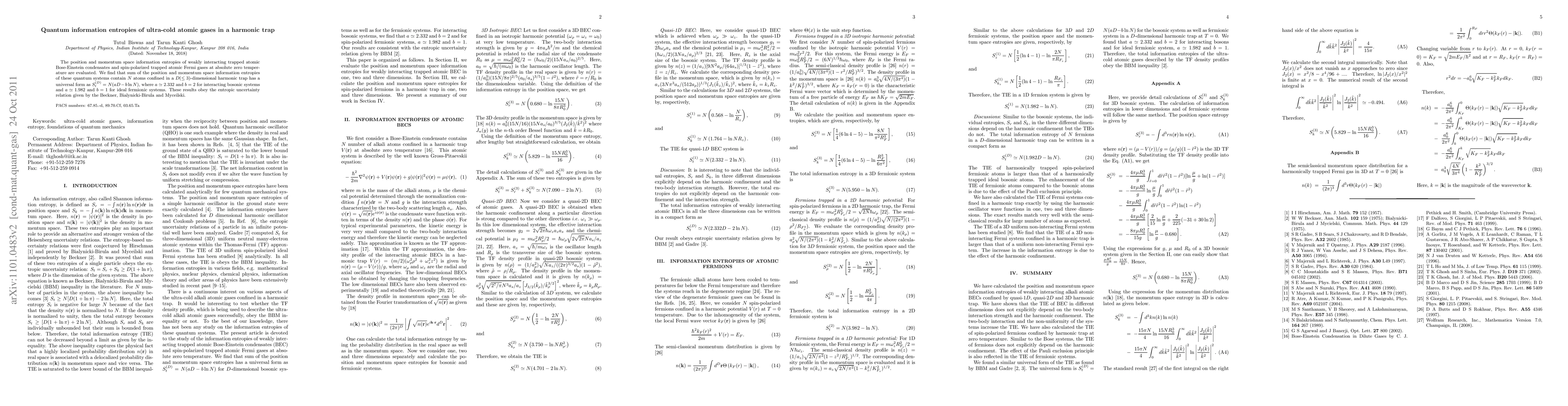 This paper evaluates the position and momentum space information entropies of ultra-cold atomic gases in harmonic traps, finding a universal form for the sum of these entropies in terms of $N$ atoms and dimensions $D$. The results reveal distinct values for $a$ and $b$ in bosonic and fermionic systems, consistent with the entropic uncertainty relation.
