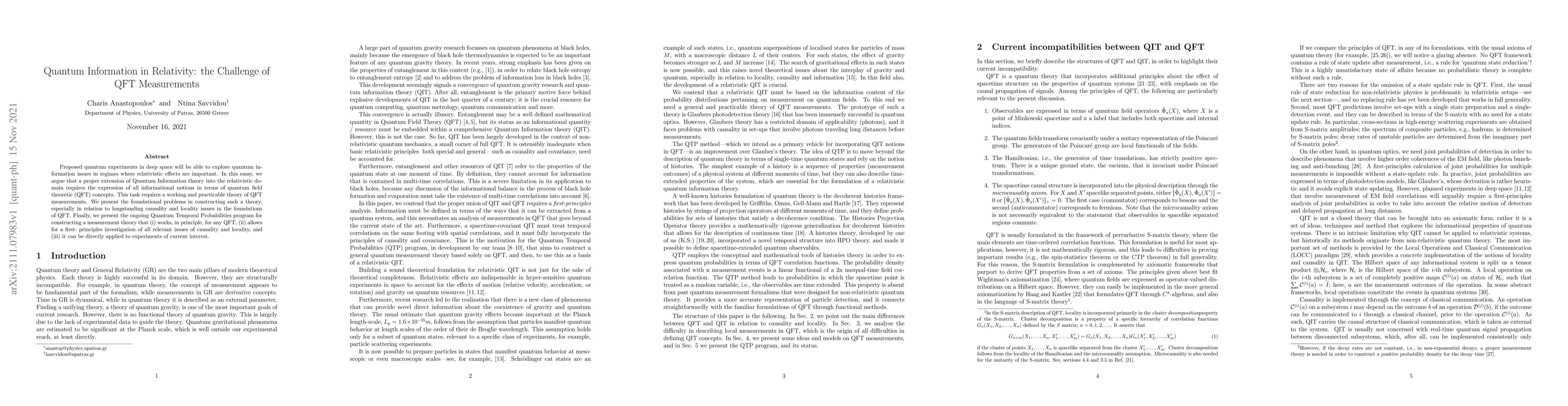 Proposed quantum experiments in deep space will be able to explore quantum information issues in regimes where relativistic effects are important. In this essay, we argue that a proper extension of Quantum Information theory into the relativistic domain requires the expression of all informational notions in terms of quantum field theoretic (QFT) concepts. This task requires a working and practicable theory of QFT measurements. We present the foundational problems in constructing such a theory, especially in relation to longstanding causality and locality issues in the foundations of QFT. Finally, we present the ongoing Quantum Temporal Probabilities program for constructing a measurement theory that (i) works, in principle, for any QFT, (ii) allows for a first-principles investigation of all relevant issues of causality and locality, and (iii) it can be directly applied to experiments of current interest.