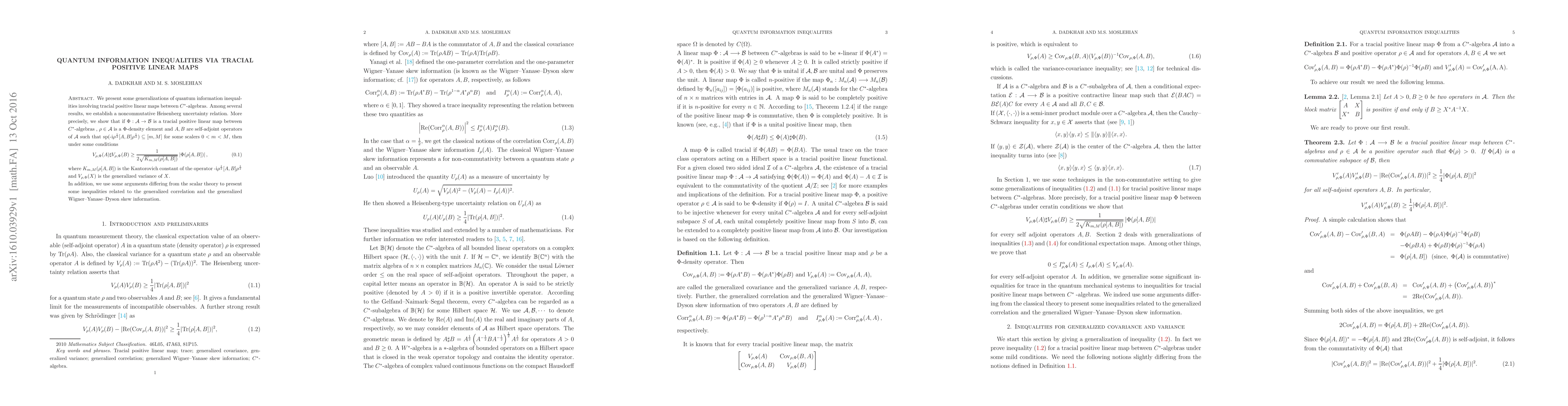This paper establishes a noncommutative Heisenberg uncertainty relation for tracial positive linear maps between $C^*$-algebras, providing a generalized version of quantum information inequalities involving density elements and self-adjoint operators.
