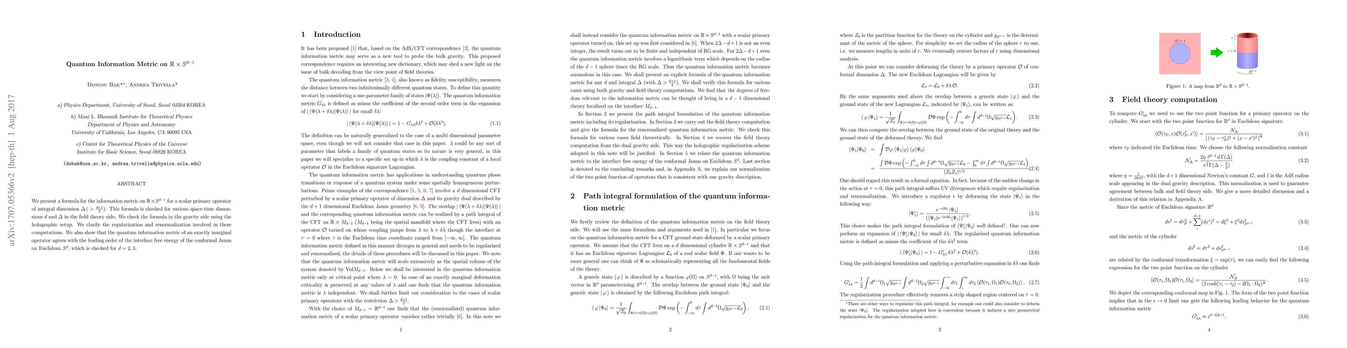 We present a formula for the information metric on $\mathbb{R} \times {S}^{d-1}$ for a scalar primary operator of integral dimension $\Delta \, (\,\, > \frac{d+1}{2})$. This formula is checked for various space-time dimensions $d$ and $\Delta$ in the field theory side. We check the formula in the gravity side using the holographic setup. We clarify the regularization and renormalization involved in these computations. We also show that the quantum information metric of an exactly marginal operator agrees with the leading order of the interface free energy of the conformal Janus on Euclidean ${S}^d$, which is checked for $d=2, 3$.