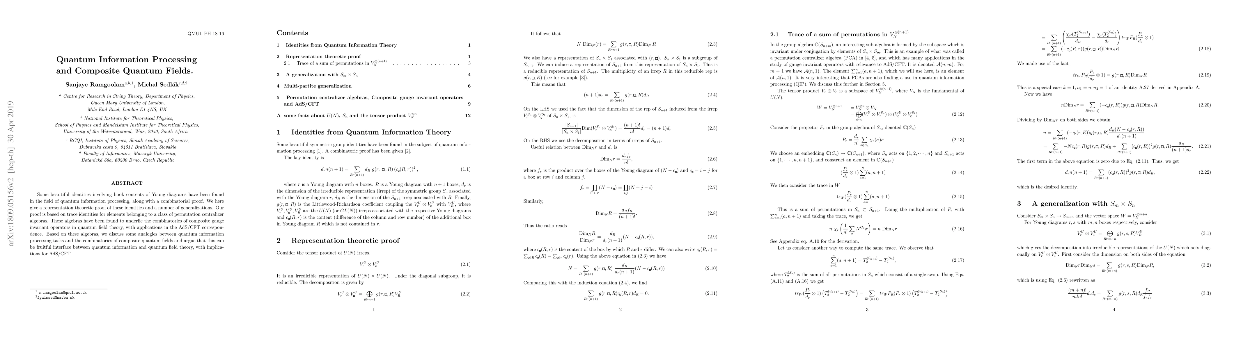 Some beautiful identities involving hook contents of Young diagrams have been found in the field of quantum information processing, along with a combinatorial proof. We here give a representation theoretic proof of these identities and a number of generalizations. Our proof is based on trace identities for elements belonging to a class of permutation centralizer algebras. These algebras have been found to underlie the combinatorics of composite gauge invariant operators in quantum field theory, with applications in the AdS/CFT correspondence. Based on these algebras, we discuss some analogies between quantum information processing tasks and the combinatorics of composite quantum fields and argue that this can be fruitful interface between quantum information and quantum field theory, with implications for AdS/CFT.