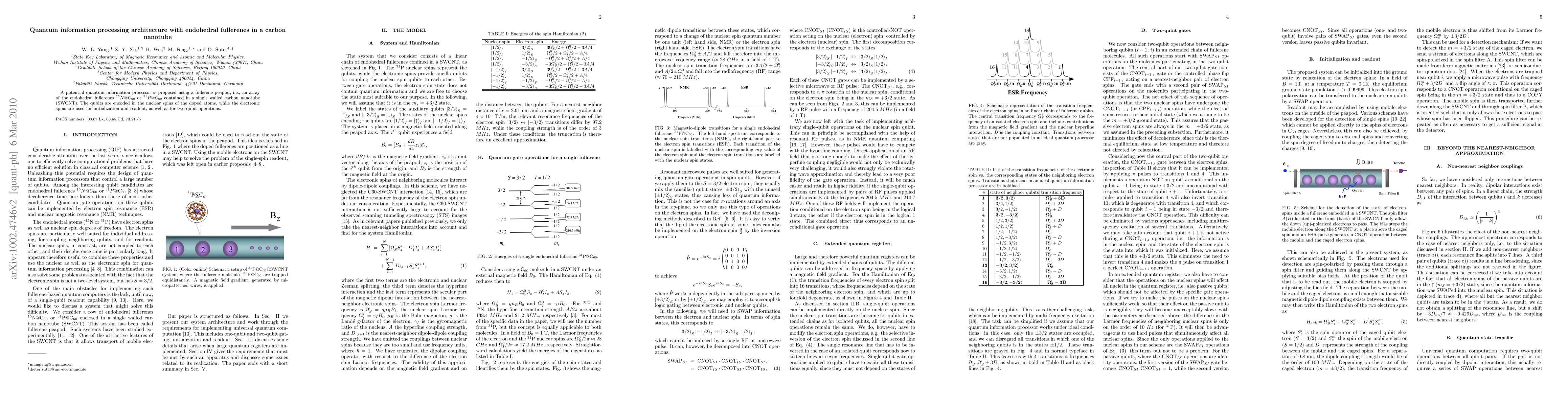 Summary: The paper proposes a quantum information processor utilizing endohedral fullerenes encapsulated within a carbon nanotube, with qubits encoded in nuclear spins of nitrogen or phosphorus atoms, and operations managed via electronic spins.