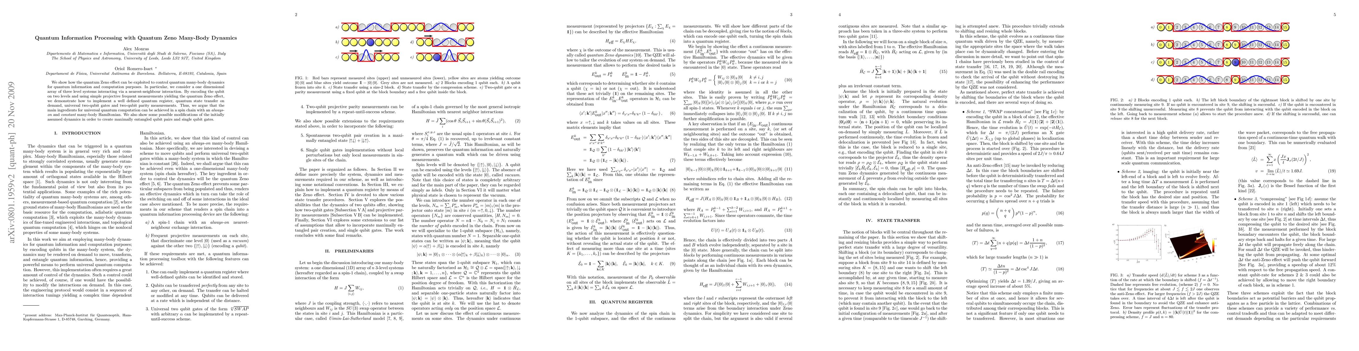 This paper demonstrates the use of the quantum Zeno effect to control quantum many-body dynamics in a one-dimensional array of three-level systems, achieving universal quantum computation capabilities through frequent projective measurements, state transfer, and entanglement generation. Modifications to the dynamics allow for the creation of entangled qubit pairs and single qubit gates.