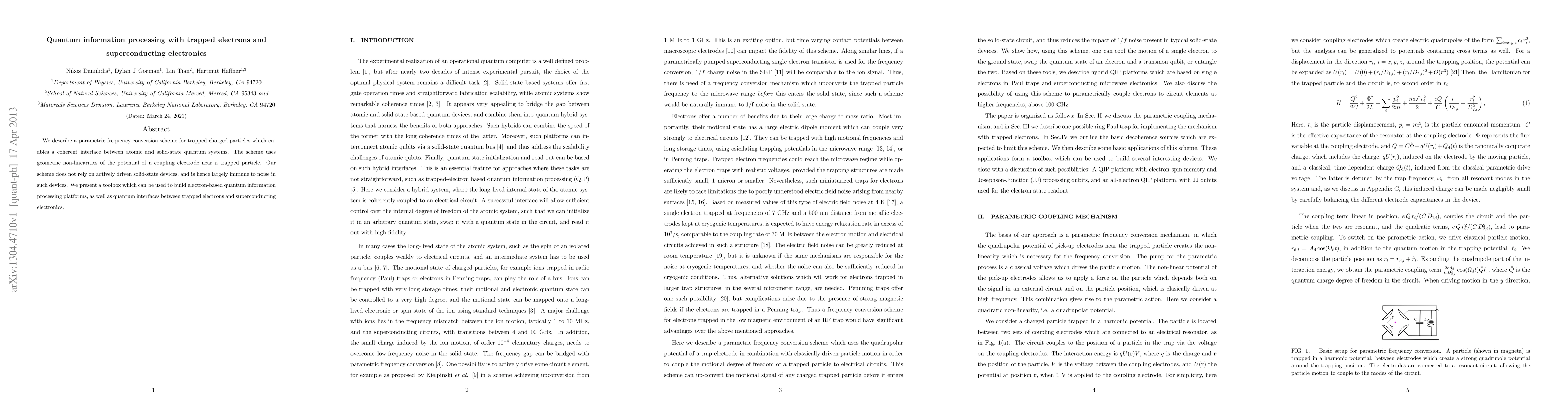 This paper proposes a parametric frequency conversion method for trapped charged particles, enabling coherent interaction between atomic and solid-state quantum systems without relying on noisy solid-state devices. It introduces a toolbox for constructing electron-based quantum information platforms and interfaces with superconducting electronics.