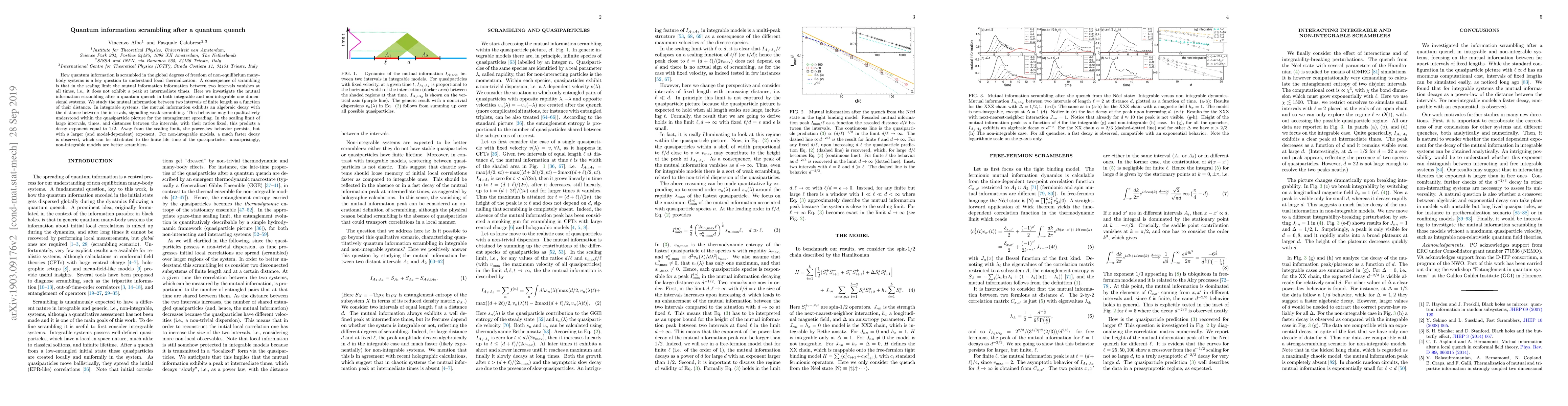 How quantum information is scrambled in the global degrees of freedom of non-equilibrium many-body systems is a key question to understand local thermalization. Here we propose that the scaling of the mutual information between two intervals of fixed length as a function of their distance is a diagnostic tool for scrambling after a quantum quench. We consider both integrable and non-integrable one dimensional systems. In integrable systems, the mutual information exhibits an algebraic decay with the distance between the intervals, signalling weak scrambling. This behavior may be qualitatively understood within the quasiparticle picture for the entanglement spreading, predicting, in the scaling limit of large intervals and times, a decay exponent equal to $1/2$. Away from the scaling limit, the power-law behavior persists, but with a larger (and model-dependent) exponent. For non-integrable models, a much faster decay is observed, which can be attributed to the finite life time of the quasiparticles: unsurprisingly, non-integrable models are better scramblers.