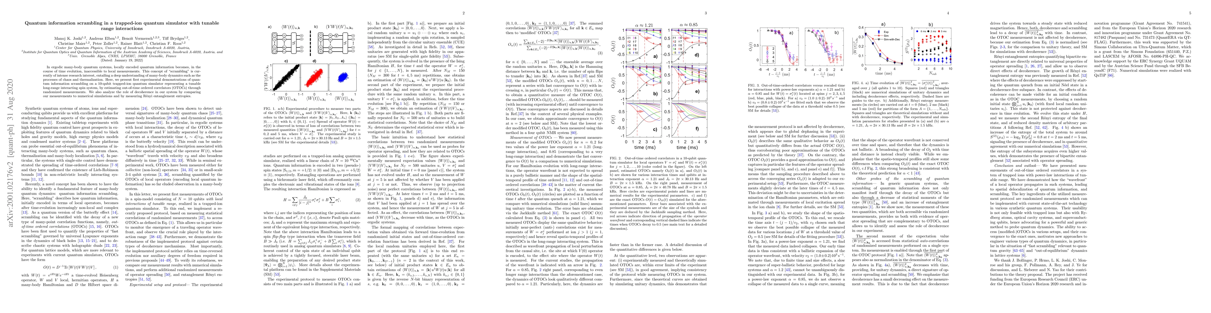 This paper demonstrates quantum information scrambling in a 10-qubit trapped-ion quantum simulator with tunable long-range interactions, using randomized measurements to estimate out-of-time ordered correlators (OTOCs). The study also investigates the impact of decoherence through comparisons with numerical simulations and measurements of Rényi entanglement entropies.