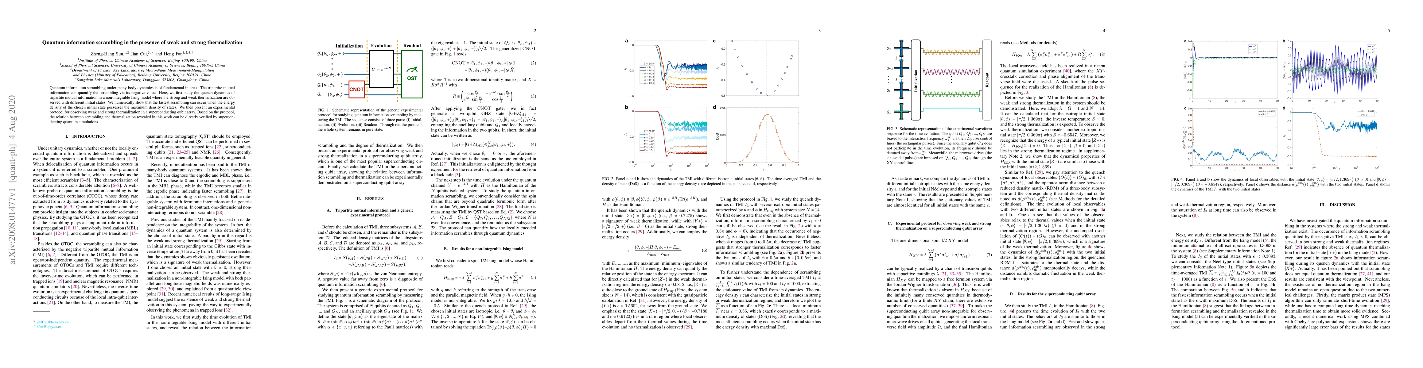 This paper investigates quantum information scrambling dynamics in a non-integrable Ising model, showing that the fastest scrambling occurs with maximum initial energy density states. It also proposes a superconducting qubit array experiment to verify the connection between scrambling and thermalization.