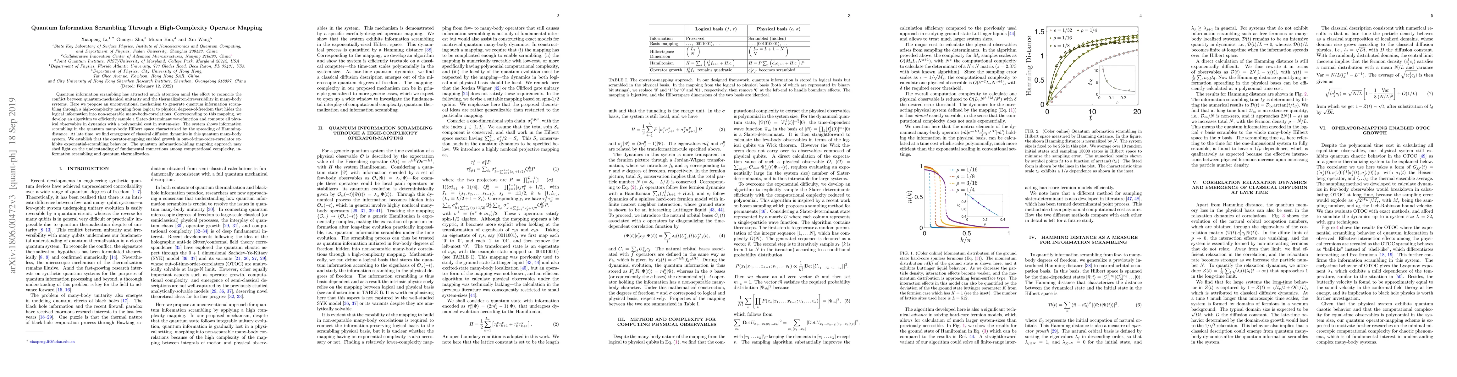 This paper proposes a novel mechanism for quantum information scrambling via a high-complexity operator mapping that transforms logical information into non-separable many-body correlations. The study introduces an efficient algorithm for sampling Slater-determinant wavefunctions and demonstrates exponential scrambling behavior in the quantum many-body system.