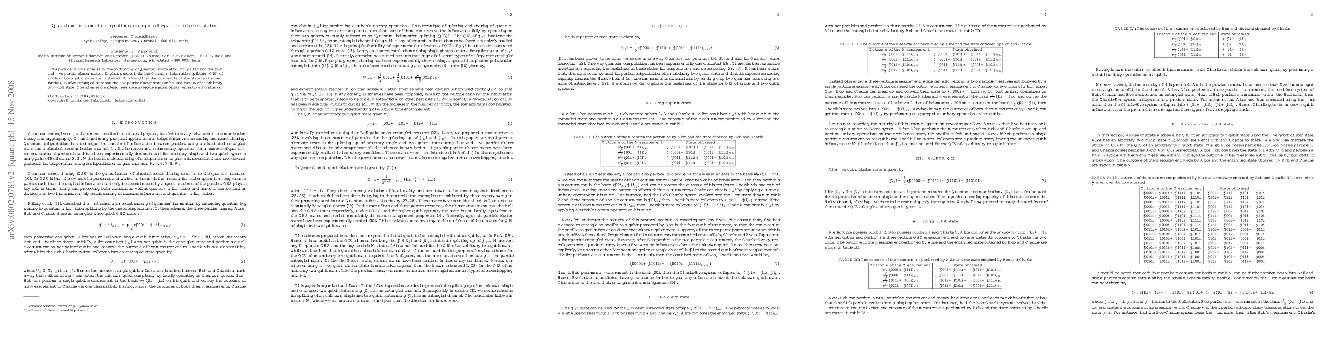 This paper presents protocols for quantum information splitting using four and five partite cluster states, demonstrating secure methods for splitting single and two qubit states, with the four partite state suitable for entangled states and the five partite for arbitrary two qubit states. The proposed schemes are resilient to specific eavesdropping attacks.