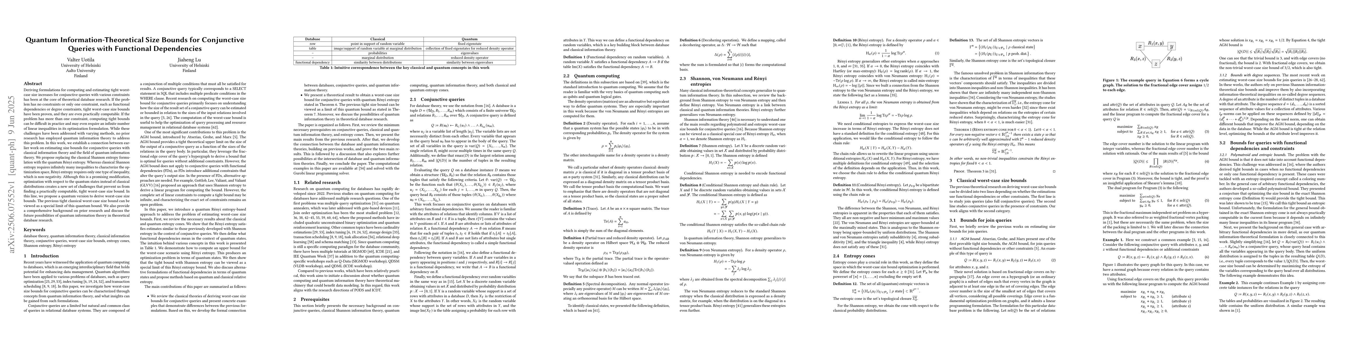 Deriving formulations for computing and estimating tight worst-case size increases for conjunctive queries with various constraints has been at the core of theoretical database research. If the problem has no constraints or only one constraint, such as functional dependencies or degree constraints, tight worst-case size bounds have been proven, and they are even practically computable. If the problem has more than one constraint, computing tight bounds can be difficult in practice and may even require an infinite number of linear inequalities in its optimization formulation. While these challenges have been addressed with varying methods, no prior research has employed quantum information theory to address this problem. In this work, we establish a connection between earlier work on estimating size bounds for conjunctive queries with classical information theory and the field of quantum information theory. We propose replacing the classical Shannon entropy formulation with the quantum R\'enyi entropy. Whereas classical Shannon entropy requires infinitely many inequalities to characterize the optimization space, R\'enyi entropy requires only one type of inequality, which is non-negativity. Although this is a promising modification, optimization with respect to the quantum states instead of classical distributions creates a new set of challenges that prevent us from finding a practically computable, tight worst-case size bound. In this line, we propose a quantum version to derive worst-case size bounds. The previous tight classical worst-case size bound can be viewed as a special limit of this quantum bound. We also provide a comprehensive background on prior research and discuss the future possibilities of quantum information theory in theoretical database research.