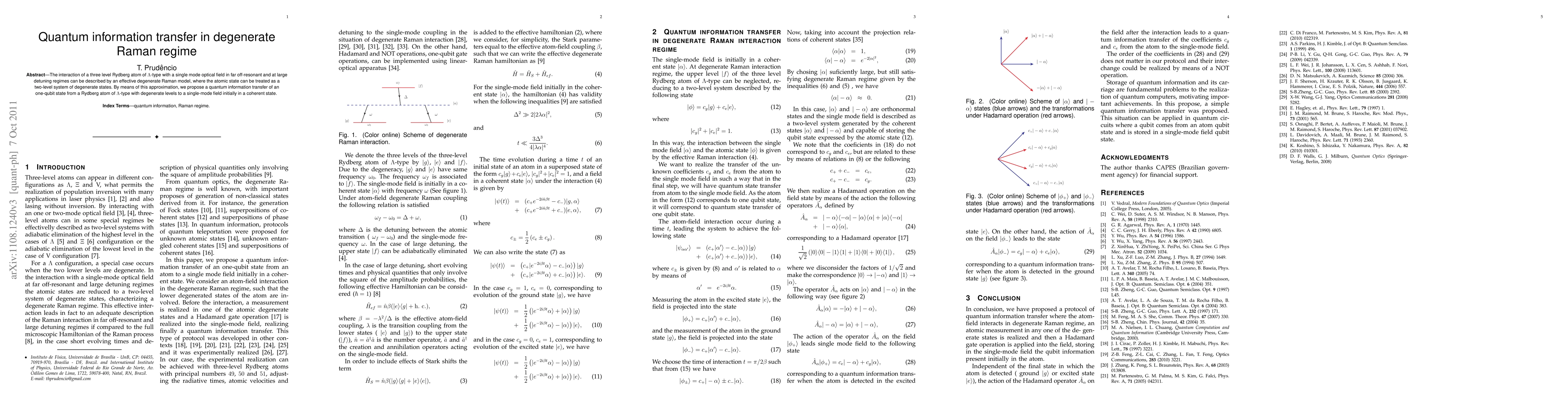 The interaction of a three level Rydberg atom of Lambda-type with a single mode optical field in far off-resonant and at large detuning regimes can be described by an effective degenerate Raman model, where the atomic state can be treated as a two-level system of degenerate states. By means of this approximation, we propose a quantum information transfer of an one-qubit state from a Rydberg atom of Lambda-type with degenerate levels to a single-mode field initially in a coherent state.